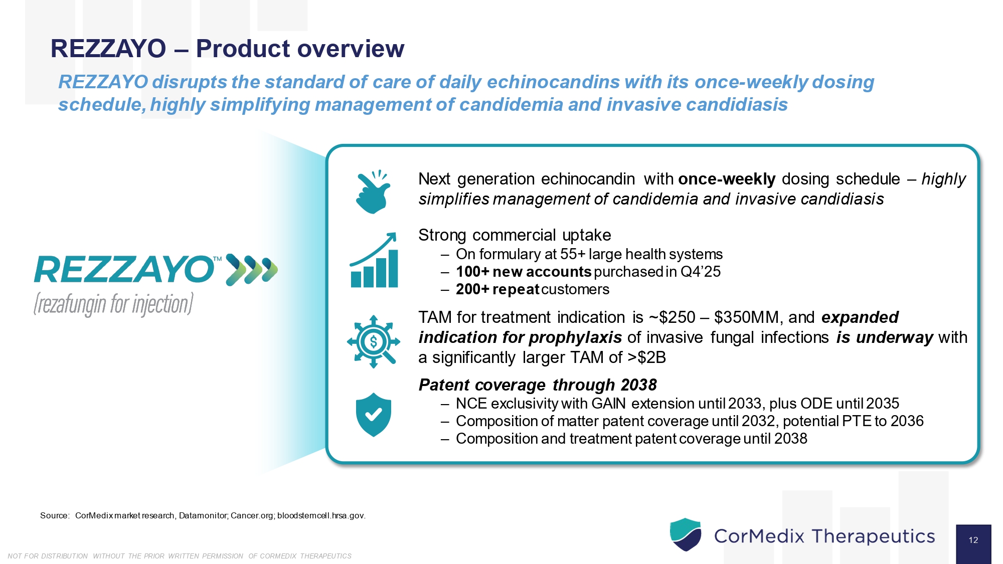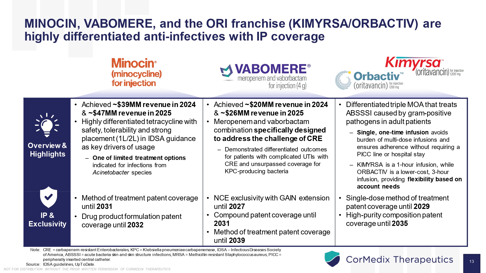 NOT FOR DISTRIBUTION WITHOUT THE PRIOR WRITTEN PERMISSION OF CORMEDIX THERAPEUTICS Next generation echinocandin with once - weekly dosing schedule – highly simplifies management of candidemia and invasive candidiasis Strong commercial uptake – On formulary at 55+ large health systems – 100+ new accounts purchased in Q4’25 – 200+ repeat customers TAM for treatment indication is ~$250 – $350MM, and expanded indication for prophylaxis of invasive fungal infections is underway with a significantly larger TAM of >$2B Patent coverage through 2038 – NCE exclusivity with GAIN extension until 2033 , plus ODE until 2035 – Composition of matter patent coverage until 2032 , potential PTE to 2036 – Composition and treatment patent coverage until 2038 12 REZZAYO disrupts the standard of care of daily echinocandins with its once - weekly dosing schedule, highly simplifying management of candidemia and invasive candidiasis Source: CorMedix market research, Datamonitor ; Cancer.org; bloodstemcell.hrsa.gov. REZZAYO – Product overview