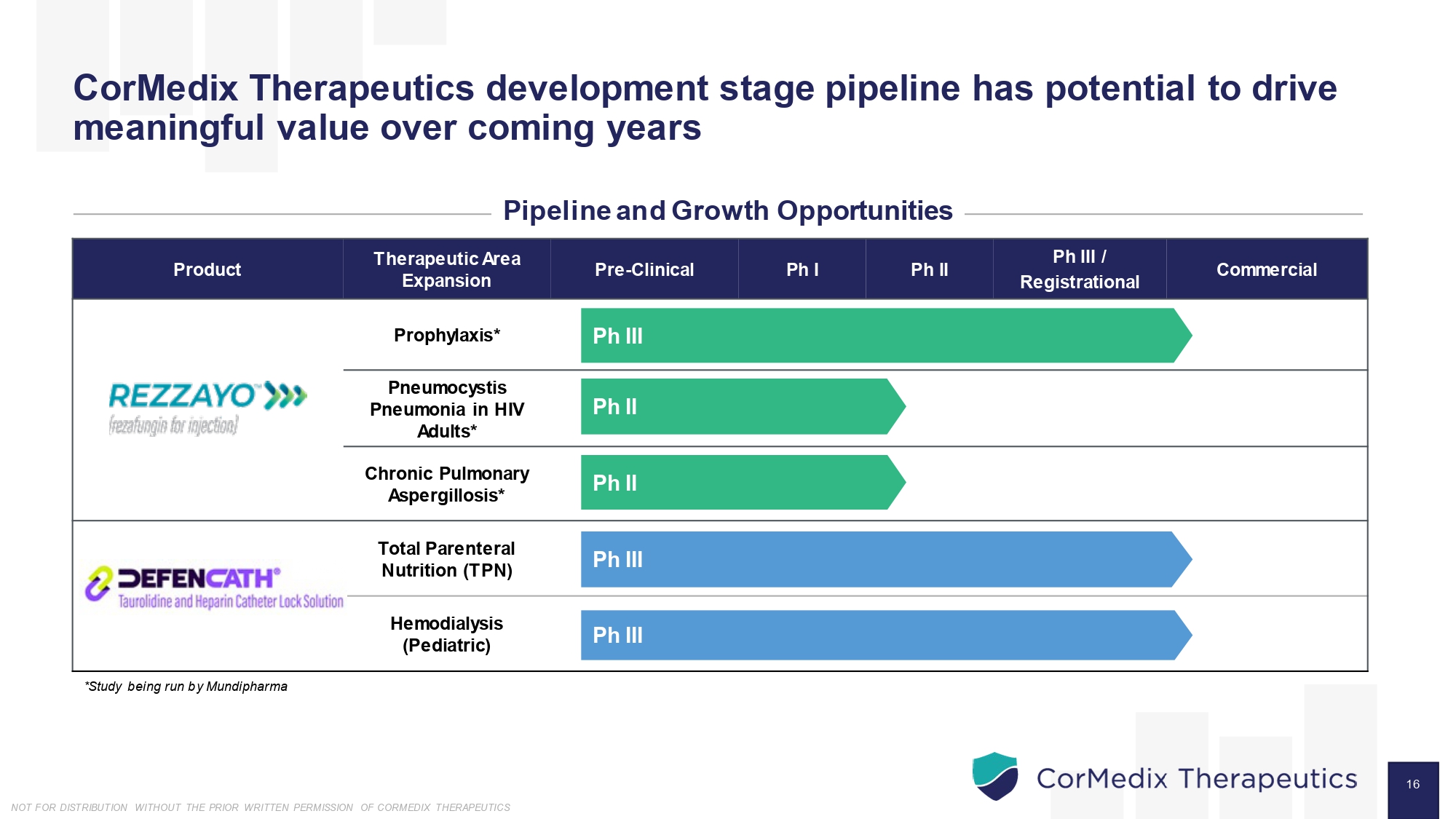 NOT FOR DISTRIBUTION WITHOUT THE PRIOR WRITTEN PERMISSION OF CORMEDIX THERAPEUTICS 15 CorMedix Therapeutics is well positioned to continue to create value as a diversified specialty pharma business with a compelling growth path Inflecting Commercial - Stage Company Strong Initial DefenCath Launch Broad Dialysis Market Penetration Durable, Diversified Revenue Streams Melinta Acquisition, Expanding Portfolio Track Record of Successfully Bringing Drugs to Market Platform for Full Suite of Institutional Products Operating at Scale High - Growth, Cash Flow Generating Business Diversified Commercial Leader Single Indication Past Diversified Portfolio with Multiple Indications & Assets Today Dynamic Institutional Platform Longer Term Ongoing Ph III studies Strategic BD and financial flexibility to pursue growth opportunities