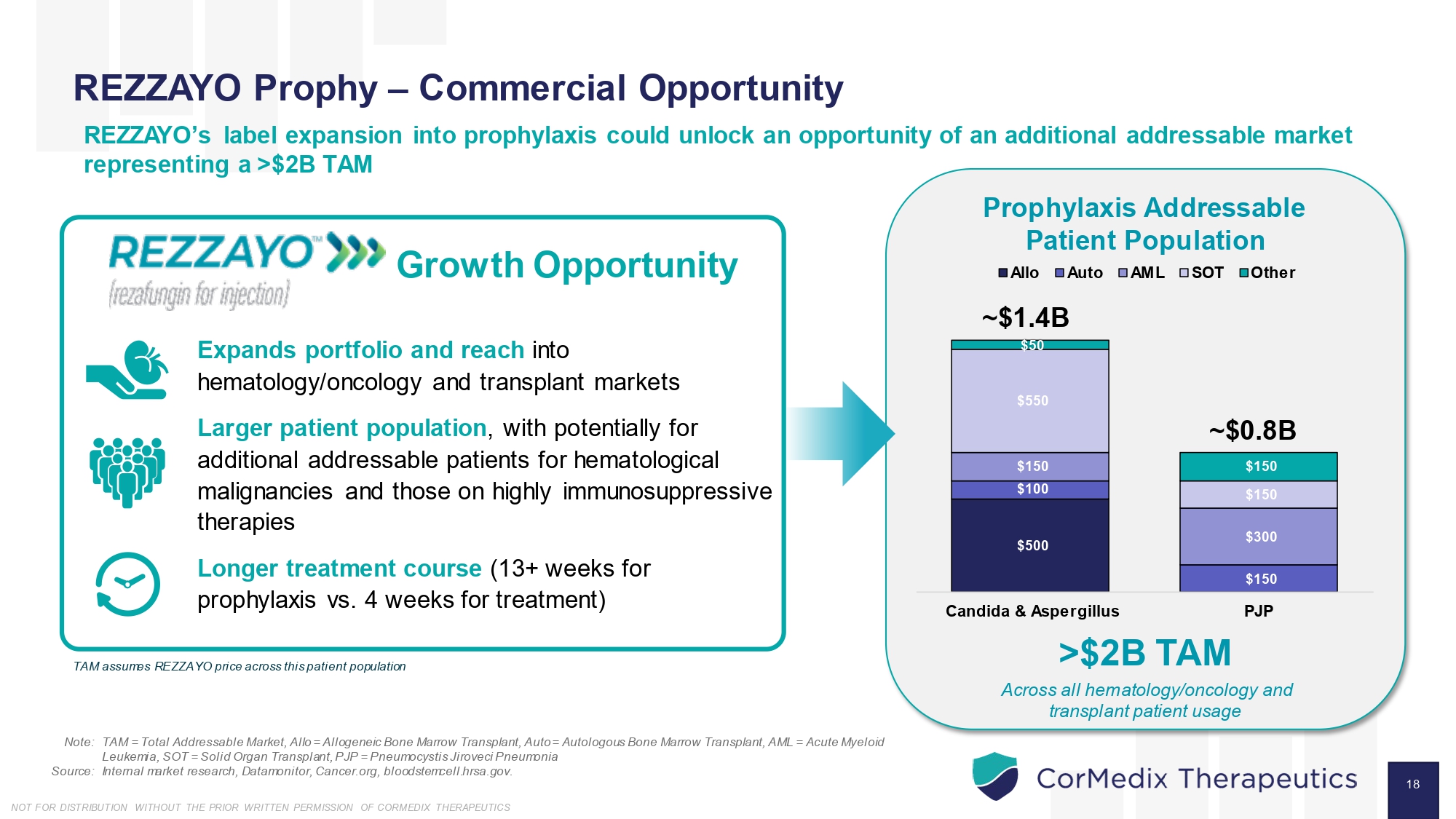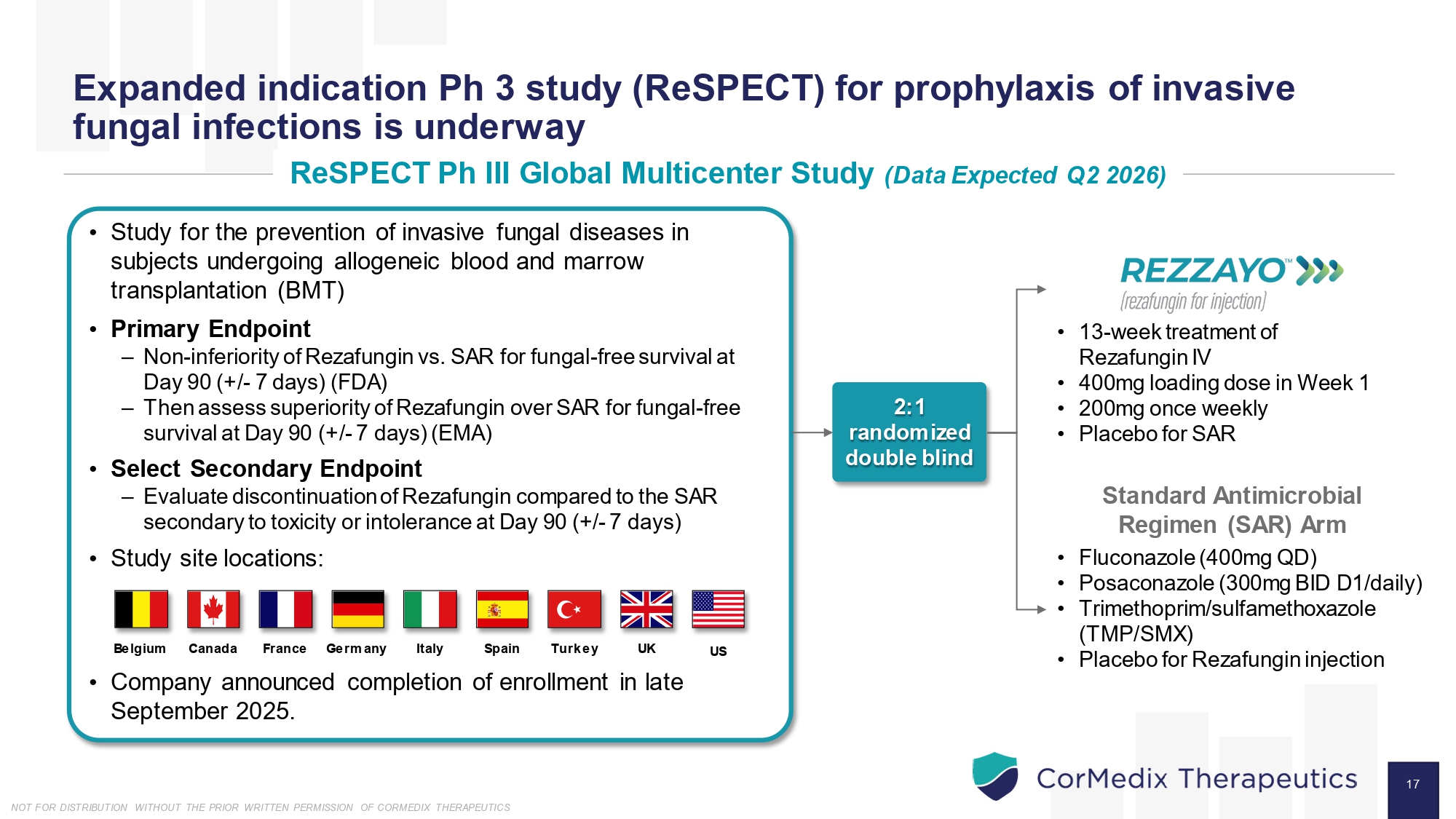 NOT FOR DISTRIBUTION WITHOUT THE PRIOR WRITTEN PERMISSION OF CORMEDIX THERAPEUTICS 17 Expanded indication Ph 3 study ( ReSPECT ) for prophylaxis of invasive fungal infections is underway • Study for the prevention of invasive fungal diseases in subjects undergoing allogeneic blood and marrow transplantation (BMT) • Primary Endpoint – Non - inferiority of Rezafungin vs. SAR for fungal - free survival at Day 90 (+/ - 7 days) (FDA) – Then assess superiority of Rezafungin over SAR for fungal - free survival at Day 90 (+/ - 7 days) (EMA) • Select Secondary Endpoint – Evaluate discontinuation of Rezafungin compared to the SAR secondary to toxicity or intolerance at Day 90 (+/ - 7 days) • Study site locations: • Company announced completion of enrollment in late September 2025. Standard Antimicrobial Regimen (SAR) Arm US Canada Belgium France Germany Italy Spain Turkey UK 2:1 randomized double blind • 13 - week treatment of Rezafungin IV • 400mg loading dose in Week 1 • 200mg once weekly • Placebo for SAR • Fluconazole (400mg QD) • Posaconazole (300mg BID D1/daily) • Trimethoprim/sulfamethoxazole (TMP/SMX) • Placebo for Rezafungin injection ReSPECT Ph III Global Multicenter Study (Data Expected Q2 2026)