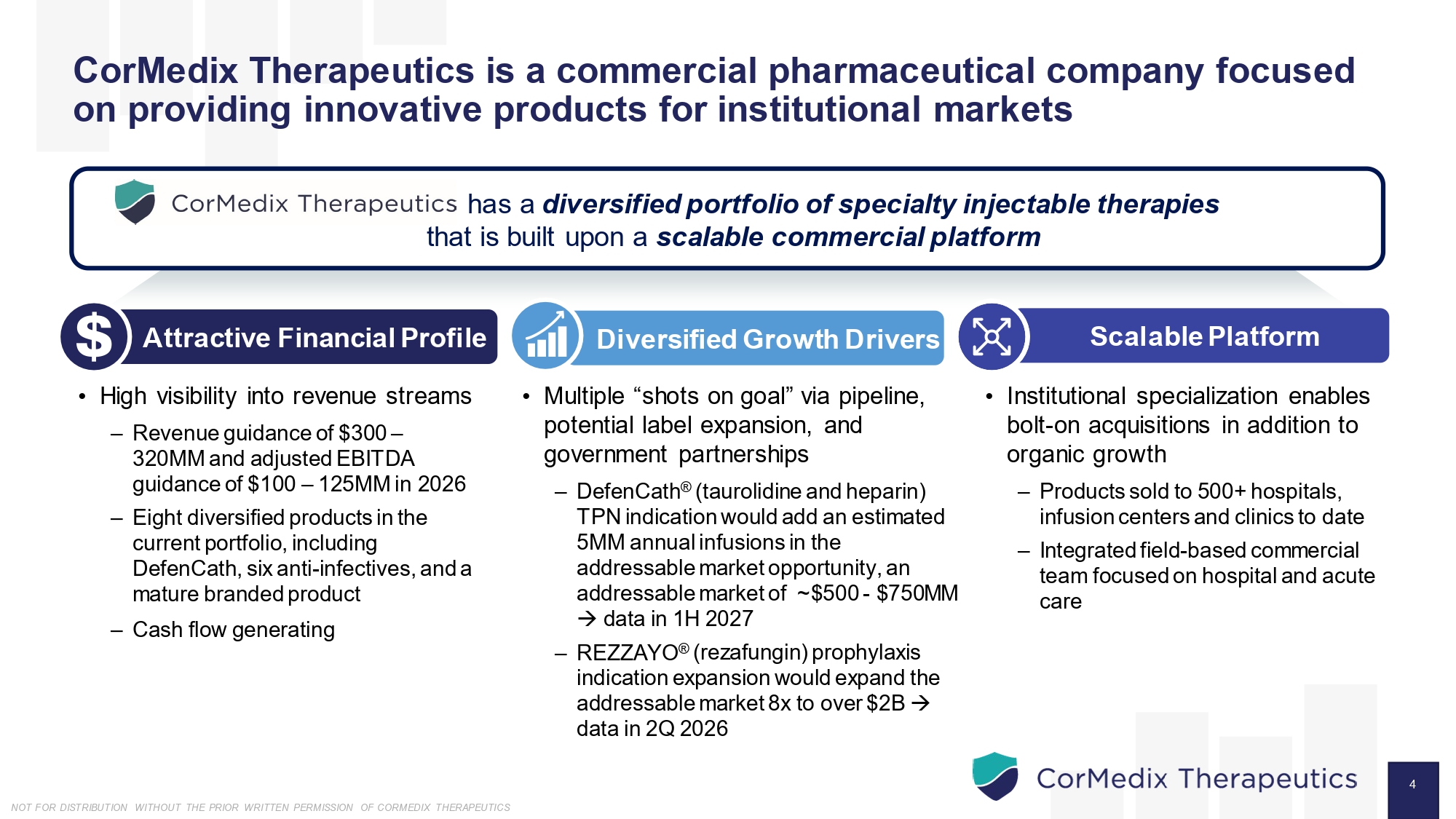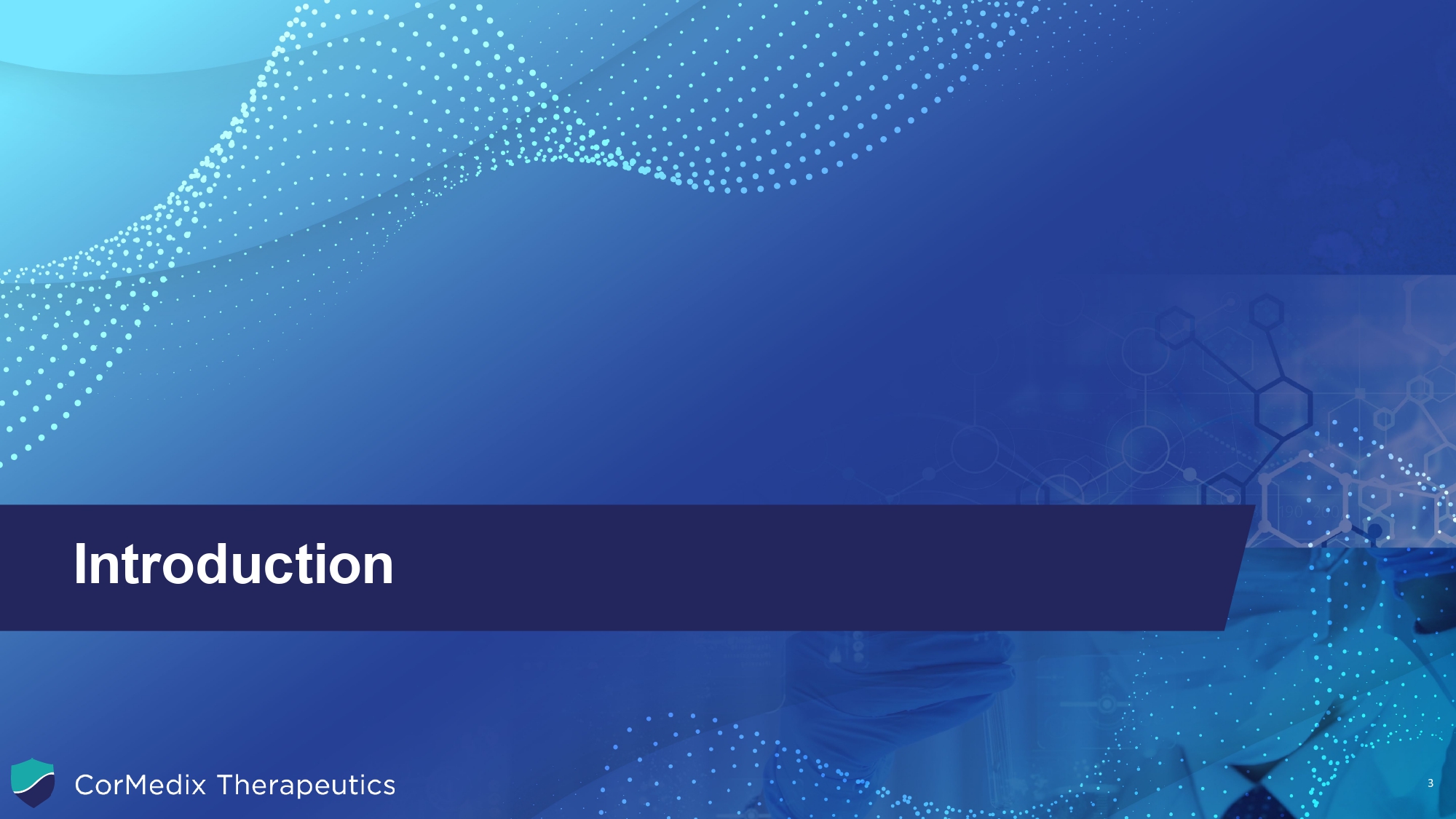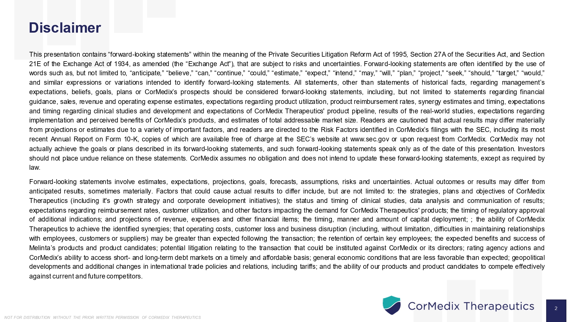 NOT FOR DISTRIBUTION WITHOUT THE PRIOR WRITTEN PERMISSION OF CORMEDIX THERAPEUTICS 2 This presentation contains “forward - looking statements” within the meaning of the Private Securities Litigation Reform Act of 1995 , Section 27 A of the Securities Act, and Section 21 E of the Exchange Act of 1934 , as amended (the “Exchange Act”), that are subject to risks and uncertainties . Forward - looking statements are often identified by the use of words such as, but not limited to, “anticipate,” “believe,” “can,” “continue,” “could,” “estimate,” “expect,” “intend,” “may,” “will,” “plan,” “project,” “seek,” “should,” “target,” “would,” and similar expressions or variations intended to identify forward - looking statements . All statements, other than statements of historical facts, regarding management’s expectations, beliefs, goals, plans or CorMedix’s prospects should be considered forward - looking statements, including, but not limited to statements regarding financial guidance, sales, revenue and operating expense estimates, expectations regarding product utilization, product reimbursement rates, synergy estimates and timing, expectations and timing regarding clinical studies and development and expectations of CorMedix Therapeutics' product pipeline, results of the real - world studies, expectations regarding implementation and perceived benefits of CorMedix’s products, and estimates of total addressable market size . Readers are cautioned that actual results may differ materially from projections or estimates due to a variety of important factors, and readers are directed to the Risk Factors identified in CorMedix’s filings with the SEC, including its most recent Annual Report on Form 10 - K, copies of which are available free of charge at the SEC’s website at www . sec . gov or upon request from CorMedix . CorMedix may not actually achieve the goals or plans described in its forward - looking statements, and such forward - looking statements speak only as of the date of this presentation . Investors should not place undue reliance on these statements . CorMedix assumes no obligation and does not intend to update these forward - looking statements, except as required by law . Forward - looking statements involve estimates, expectations, projections, goals, forecasts, assumptions, risks and uncertainties . Actual outcomes or results may differ from anticipated results, sometimes materially . Factors that could cause actual results to differ include, but are not limited to : the strategies, plans and objectives of CorMedix Therapeutics (including it's growth strategy and corporate development initiatives) ; the status and timing of clinical studies, data analysis and communication of results ; expectations regarding reimbursement rates, customer utilization, and other factors impacting the demand for CorMedix Therapeutics' products ; the timing of regulatory approval of additional indications ; and projections of revenue, expenses and other financial items ; the timing, manner and amount of capital deployment ; ; the ability of CorMedix Therapeutics to achieve the identified synergies ; that operating costs, customer loss and business disruption (including, without limitation, difficulties in maintaining relationships with employees, customers or suppliers) may be greater than expected following the transaction ; the retention of certain key employees ; the expected benefits and success of Melinta’s products and product candidates ; potential litigation relating to the transaction that could be instituted against CorMedix or its directors ; rating agency actions and CorMedix’s ability to access short - and long - term debt markets on a timely and affordable basis ; general economic conditions that are less favorable than expected ; geopolitical developments and additional changes in international trade policies and relations, including tariffs ; and the ability of our products and product candidates to compete effectively against current and future competitors . Disclaimer