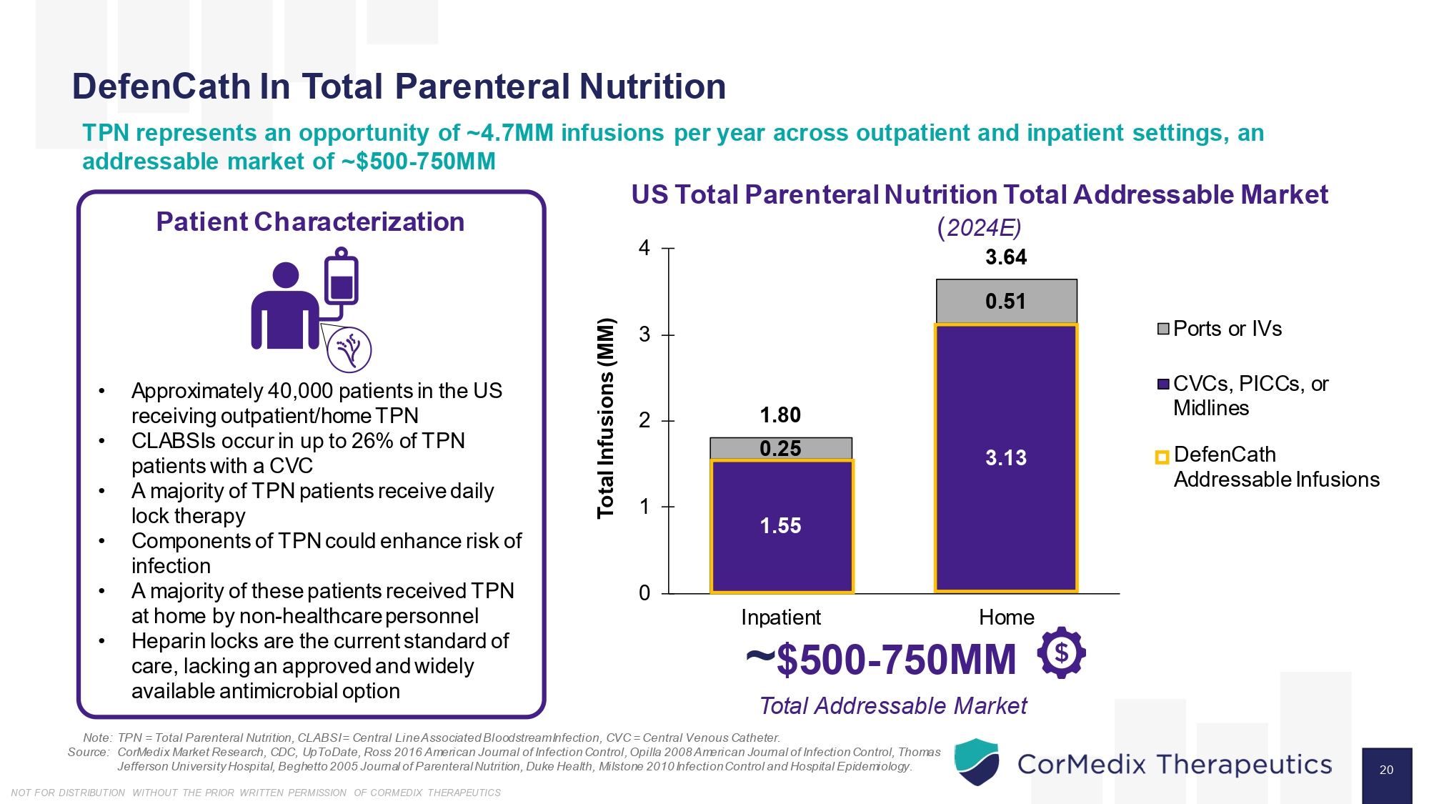 NOT FOR DISTRIBUTION WITHOUT THE PRIOR WRITTEN PERMISSION OF CORMEDIX THERAPEUTICS 19 Expanded indication Ph 3 study (NUTRI - LOCK) for CLABSIs in adult TPN patients is underway Program Overview: A Ph 3, randomized, double - blind, adaptive, 2 - arm, study assessing the safety and efficacy of DefenCath in reducing central line - associated bloodstream infections (CLABSIs) in adult patients receiving total parenteral nutrition (TPN) via central venous catheter (CVC) Subjects 90 target; 200 max Enrollment is on - going Total Sites in the U.S. & Turkey 25 Ph 3, Duration of treatment 12 months Randomization 2:1 (60:30) To evaluate the efficacy of DefenCath in reducing the incidence of CLABSI over 12 months compared with heparin as a catheter lock solution (CLS) Primary Endpoint