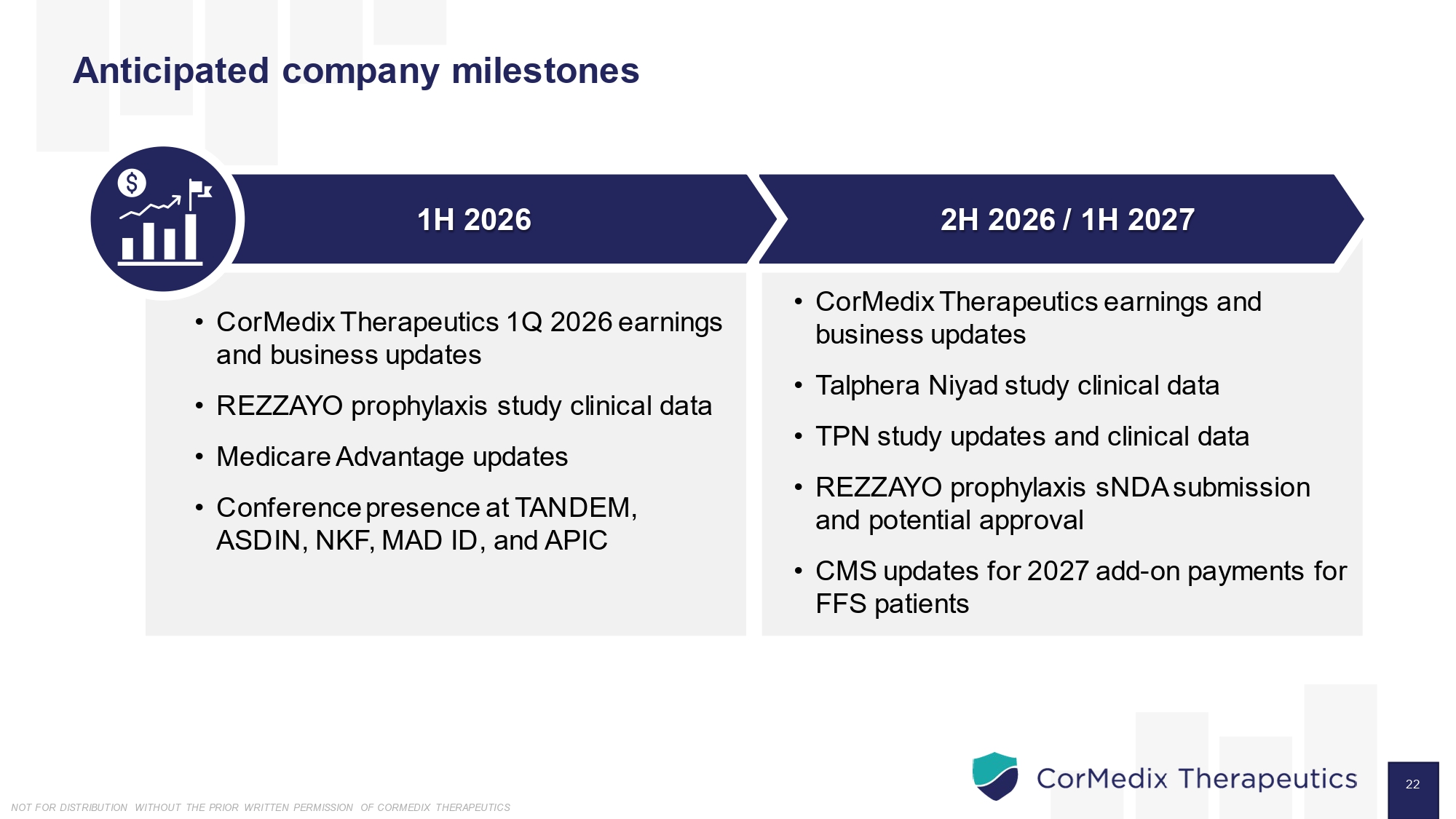 NOT FOR DISTRIBUTION WITHOUT THE PRIOR WRITTEN PERMISSION OF CORMEDIX THERAPEUTICS Strategic Investment in In 2025, CorMedix Therapeutics made a strategic investment in Talphera in return for the right of first negotiation . This period will be triggered by announcement of Phase III NEPHRO study results for Niyad ( nafamostat mesylate) Niyad provides an opportunity to acquire a significant improvement to standard of care in continuous renal replacement therapy (CRRT) which could provide an additional growth driver in 2027 and beyond . 21 CorMedix Therapeutics has strong financial flexibility to pursue business development opportunities Strong Cash Position CorMedix Therapeutics as of December 31, 2025 has a strong cash position consisting of ~$149MM of cash and short - term investments and sustainable profitability from currently marketed products. The strong cash position in tandem with a strong base of sustainable profitability puts CorMedix Therapeutics in a position to continue to pursue accretive business development opportunities.