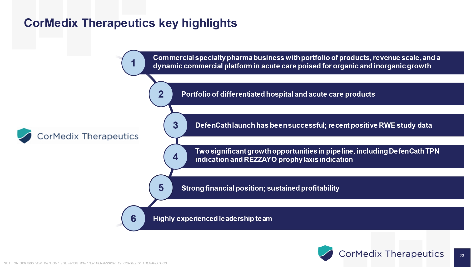 NOT FOR DISTRIBUTION WITHOUT THE PRIOR WRITTEN PERMISSION OF CORMEDIX THERAPEUTICS 22 Anticipated company milestones 2 H 2026 / 1H 2027 1 H 2026 • CorMedix Therapeutics 1Q 2026 earnings and business updates • REZZAYO prophylaxis study clinical data • Medicare Advantage updates • Conference presence at TANDEM, ASDIN, NKF, MAD ID, and APIC • CorMedix Therapeutics earnings and business updates • Talphera Niyad study clinical data • TPN study updates and clinical data • REZZAYO prophylaxis sNDA submission and potential approval • CMS updates for 2027 add - on payments for FFS patients