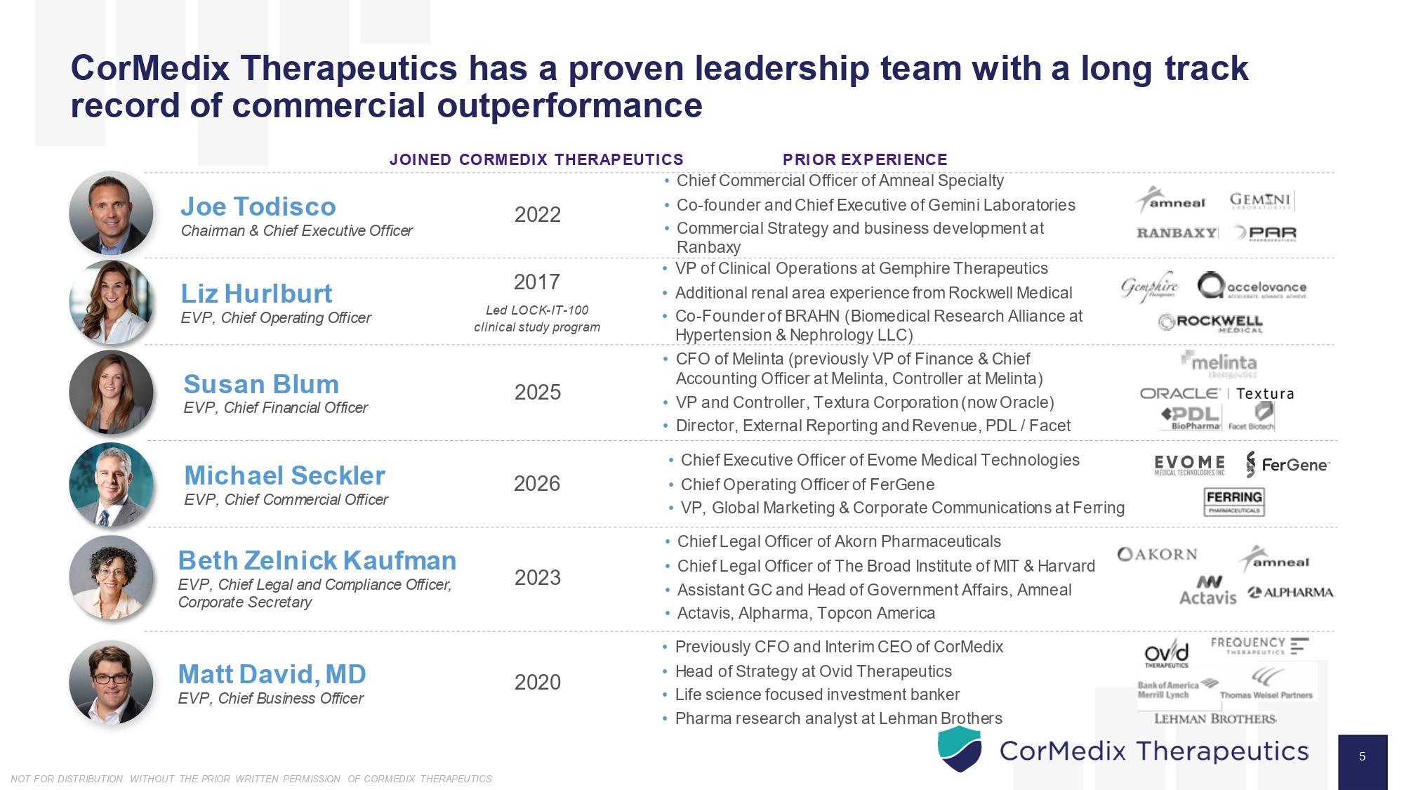 NOT FOR DISTRIBUTION WITHOUT THE PRIOR WRITTEN PERMISSION OF CORMEDIX THERAPEUTICS 4 CorMedix Therapeutics is a commercial pharmaceutical company focused on providing innovative products for institutional markets has a diversified portfolio of specialty injectable therapies that is built upon a scalable commercial platform • Multiple “shots on goal” via pipeline, potential label expansion, and government partnerships – DefenCath ® (taurolidine and heparin) TPN indication would add an estimated 5MM annual infusions in the addressable market opportunity, an addressable market of ~$500 - $750MM data in 1H 2027 – REZZAYO ® ( rezafungin ) prophylaxis indication expansion would expand the addressable market 8 x to over $2B data in 2Q 2026 • Institutional specialization enables bolt - on acquisitions in addition to organic growth – Products sold to 500+ hospitals, infusion centers and clinics to date – Integrated field - based commercial team focused on hospital and acute care • High visibility into revenue streams – Revenue guidance of $300 – 320MM and adjusted EBITDA guidance of $100 – 125MM in 2026 – Eight diversified products in the current portfolio, including DefenCath , six anti - infectives, and a mature branded product – Cash flow generating Attractive Financial Profile Scalable Platform Diversified Growth Drivers