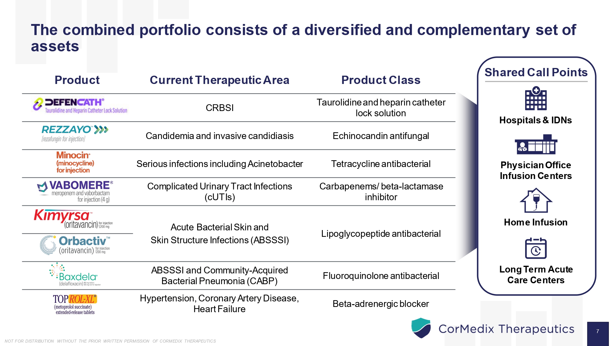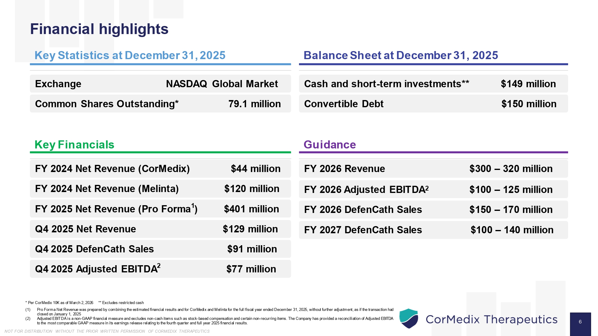 NOT FOR DISTRIBUTION WITHOUT THE PRIOR WRITTEN PERMISSION OF CORMEDIX THERAPEUTICS 6 Financial highlights * Per CorMedix 10K as of March 2, 2026 ** Excludes restricted cash (1) Pro Forma Net Revenue was prepared by combining the estimated financial results and for CorMedix and Melinta for the full fis cal year ended December 31, 2025, without further adjustment, as if the transaction had closed on January 1, 2025 (2) Adjusted EBITDA is a non - GAAP financial measure and excludes non - cash items such as stock - based compensation and certain non - rec urring items. The Company has provided a reconciliation of Adjusted EBITDA to the most comparable GAAP measure in its earnings release relating to the fourth quarter and full year 2025 financial resul ts. Guidance Key Financials Balance Sheet at December 31, 2025 Key Statistics at December 31, 2025 FY 2025 Net Revenue (Pro Forma 1 ) $401 million FY 2024 Net Revenue (CorMedix) $44 million Q4 2025 Adjusted EBITDA 2 $77 million Q4 2025 Net Revenue $129 million FY 2026 DefenCath Sales $150 – 170 million FY 2026 Adjusted EBITDA 2 $100 – 125 million FY 2026 Revenue $300 – 320 million Common Shares Outstanding* 79.1 million Exchange NASDAQ Global Market Convertible Debt $150 million Cash and short - term investments** $149 million FY 2027 DefenCath Sales $100 – 140 million FY 2024 Net Revenue (Melinta) $120 million Q4 2025 DefenCath Sales $91 million