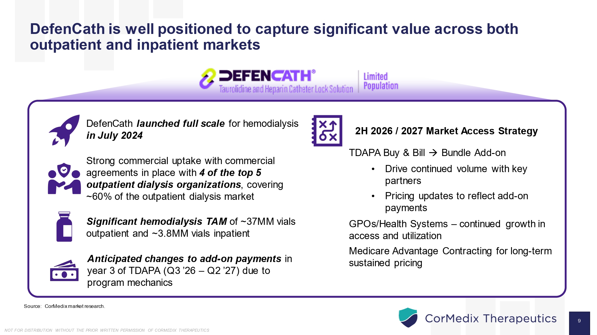 NOT FOR DISTRIBUTION WITHOUT THE PRIOR WRITTEN PERMISSION OF CORMEDIX THERAPEUTICS 9 DefenCath is well positioned to capture significant value across both outpatient and inpatient markets Source: CorMedix market research. DefenCath launched full scale for hemodialysis in July 2024 Strong commercial uptake with commercial agreements in place with 4 of the top 5 outpatient dialysis organizations , covering ~60% of the outpatient dialysis market Significant hemodialysis TAM of ~37MM vials outpatient and ~3.8MM vials inpatient 2H 2026 / 2027 Market Access Strategy TDAPA Buy & Bill Bundle Add - on • Drive continued volume with key partners • Pricing updates to reflect add - on payments GPOs/Health Systems – continued growth in access and utilization Medicare Advantage Contracting for long - term sustained pricing Anticipated changes to add - on payments in year 3 of TDAPA (Q3 ’26 – Q2 ’27) due to program mechanics