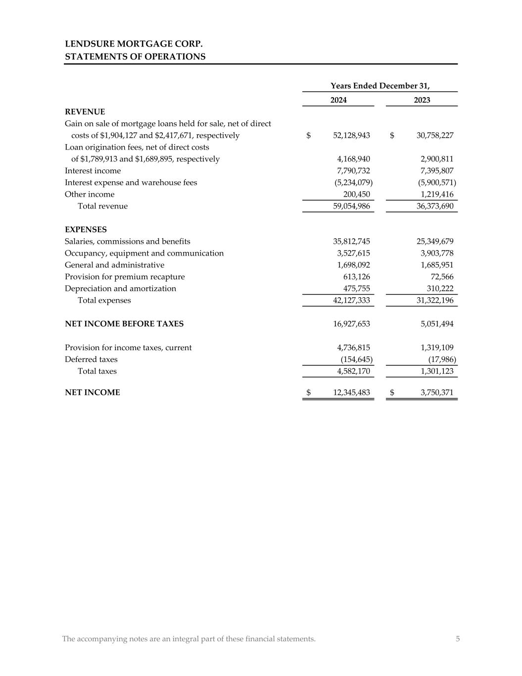 STATEMENTS OF OPERATIONS 2024 2023 REVENUE Gain on sale of mortgage loans held for sale, net of direct costs of $1,904,127 and $2,417,671, respectively 52,128,943$ 30,758,227$ Loan origination fees, net of direct costs of $1,789,913 and $1,689,895, respectively 4,168,940 2,900,811 Interest income 7,790,732 7,395,807 Interest expense and warehouse fees (5,234,079) (5,900,571) Other income 200,450 1,219,416 Total revenue 59,054,986 36,373,690 EXPENSES Salaries, commissions and benefits 35,812,745 25,349,679 Occupancy, equipment and communication 3,527,615 3,903,778 General and administrative 1,698,092 1,685,951 Provision for premium recapture 613,126 72,566 Depreciation and amortization 475,755 310,222 Total expenses 42,127,333 31,322,196 NET INCOME BEFORE TAXES 16,927,653 5,051,494 Provision for income taxes, current 4,736,815 1,319,109 Deferred taxes (154,645) (17,986) Total taxes 4,582,170 1,301,123 NET INCOME 12,345,483$ 3,750,371$ LENDSURE MORTGAGE CORP. Years Ended December 31, The accompanying notes are an integral part of these financial statements. 5