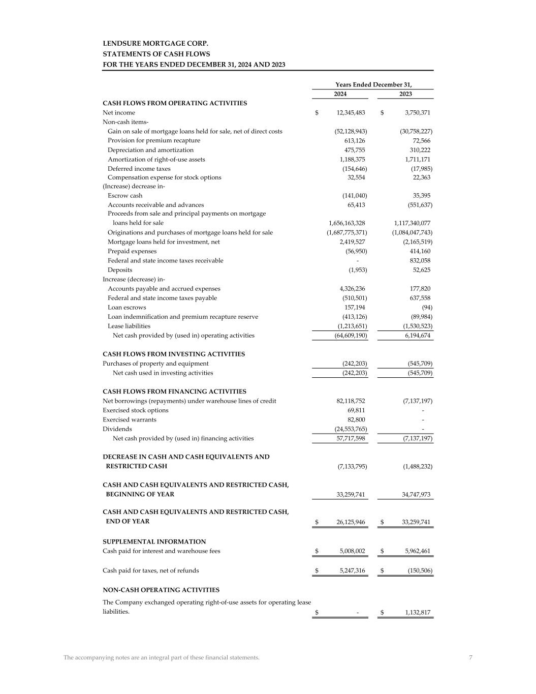 LENDSURE MORTGAGE CORP. STATEMENTS OF CASH FLOWS FOR THE YEARS ENDED DECEMBER 31, 2024 AND 2023 2024 2023 CASH FLOWS FROM OPERATING ACTIVITIES Net income 12,345,483$ 3,750,371$ Non-cash items- Gain on sale of mortgage loans held for sale, net of direct costs (52,128,943) (30,758,227) Provision for premium recapture 613,126 72,566 Depreciation and amortization 475,755 310,222 Amortization of right-of-use assets 1,188,375 1,711,171 Deferred income taxes (154,646) (17,985) Compensation expense for stock options 32,554 22,363 (Increase) decrease in- Escrow cash (141,040) 35,395 Accounts receivable and advances 65,413 (551,637) Proceeds from sale and principal payments on mortgage loans held for sale 1,656,163,328 1,117,340,077 Originations and purchases of mortgage loans held for sale (1,687,775,371) (1,084,047,743) Mortgage loans held for investment, net 2,419,527 (2,165,519) Prepaid expenses (56,950) 414,160 Federal and state income taxes receivable - 832,058 Deposits (1,953) 52,625 Increase (decrease) in- Accounts payable and accrued expenses 4,326,236 177,820 Federal and state income taxes payable (510,501) 637,558 Loan escrows 157,194 (94) Loan indemnification and premium recapture reserve (413,126) (89,984) Lease liabilities (1,213,651) (1,530,523) Net cash provided by (used in) operating activities (64,609,190) 6,194,674 CASH FLOWS FROM INVESTING ACTIVITIES Purchases of property and equipment (242,203) (545,709) Net cash used in investing activities (242,203) (545,709) CASH FLOWS FROM FINANCING ACTIVITIES Net borrowings (repayments) under warehouse lines of credit 82,118,752 (7,137,197) Exercised stock options 69,811 - Exercised warrants 82,800 - Dividends (24,553,765) - Net cash provided by (used in) financing activities 57,717,598 (7,137,197) DECREASE IN CASH AND CASH EQUIVALENTS AND RESTRICTED CASH (7,133,795) (1,488,232) CASH AND CASH EQUIVALENTS AND RESTRICTED CASH, BEGINNING OF YEAR 33,259,741 34,747,973 CASH AND CASH EQUIVALENTS AND RESTRICTED CASH, END OF YEAR 26,125,946$ 33,259,741$ SUPPLEMENTAL INFORMATION Cash paid for interest and warehouse fees 5,008,002$ 5,962,461$ Cash paid for taxes, net of refunds 5,247,316$ (150,506)$ NON-CASH OPERATING ACTIVITIES The Company exchanged operating right-of-use assets for operating lease liabilities. -$ 1,132,817$ Years Ended December 31, The accompanying notes are an integral part of these financial statements. 7