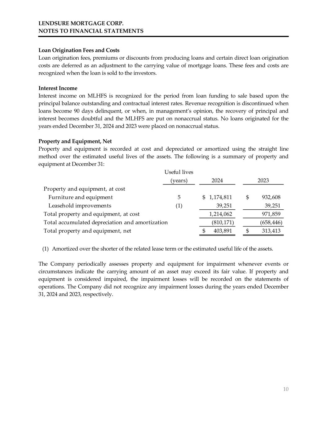 LENDSURE MORTGAGE CORP. NOTES TO FINANCIAL STATEMENTS 10 Loan Origination Fees and Costs Loan origination fees, premiums or discounts from producing loans and certain direct loan origination costs are deferred as an adjustment to the carrying value of mortgage loans. These fees and costs are recognized when the loan is sold to the investors. Interest Income Interest income on MLHFS is recognized for the period from loan funding to sale based upon the principal balance outstanding and contractual interest rates. Revenue recognition is discontinued when loans become 90 days delinquent, or when, in management’s opinion, the recovery of principal and interest becomes doubtful and the MLHFS are put on nonaccrual status. No loans originated for the years ended December 31, 2024 and 2023 were placed on nonaccrual status. Property and Equipment, Net Property and equipment is recorded at cost and depreciated or amortized using the straight line method over the estimated useful lives of the assets. The following is a summary of property and equipment at December 31: (1) Amortized over the shorter of the related lease term or the estimated useful life of the assets. The Company periodically assesses property and equipment for impairment whenever events or circumstances indicate the carrying amount of an asset may exceed its fair value. If property and equipment is considered impaired, the impairment losses will be recorded on the statements of operations. The Company did not recognize any impairment losses during the years ended December 31, 2024 and 2023, respectively. Useful lives (years) 2024 2023 Property and equipment, at cost Furniture and equipment 5 1,174,811$ 932,608$ Leasehold improvements (1) 39,251 39,251 Total property and equipment, at cost 1,214,062 971,859 Total accumulated depreciation and amortization (810,171) (658,446) Total property and equipment, net 403,891$ 313,413$
