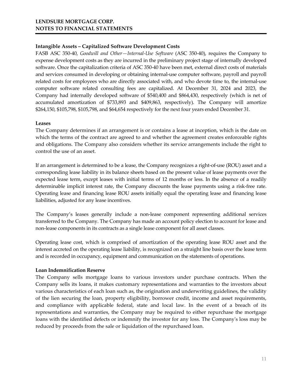 LENDSURE MORTGAGE CORP. NOTES TO FINANCIAL STATEMENTS 11 Intangible Assets – Capitalized Software Development Costs FASB ASC 350-40, Goodwill and Other—Internal-Use Software (ASC 350-40), requires the Company to expense development costs as they are incurred in the preliminary project stage of internally developed software. Once the capitalization criteria of ASC 350-40 have been met, external direct costs of materials and services consumed in developing or obtaining internal-use computer software, payroll and payroll related costs for employees who are directly associated with, and who devote time to, the internal-use computer software related consulting fees are capitalized. At December 31, 2024 and 2023, the Company had internally developed software of $540,400 and $864,430, respectively (which is net of accumulated amortization of $733,893 and $409,863, respectively). The Company will amortize $264,150, $105,798, $105,798, and $64,654 respectively for the next four years ended December 31. Leases The Company determines if an arrangement is or contains a lease at inception, which is the date on which the terms of the contract are agreed to and whether the agreement creates enforceable rights and obligations. The Company also considers whether its service arrangements include the right to control the use of an asset. If an arrangement is determined to be a lease, the Company recognizes a right-of-use (ROU) asset and a corresponding lease liability in its balance sheets based on the present value of lease payments over the expected lease term, except leases with initial terms of 12 months or less. In the absence of a readily determinable implicit interest rate, the Company discounts the lease payments using a risk-free rate. Operating lease and financing lease ROU assets initially equal the operating lease and financing lease liabilities, adjusted for any lease incentives. The Company’s leases generally include a non-lease component representing additional services transferred to the Company. The Company has made an account policy election to account for lease and non-lease components in its contracts as a single lease component for all asset classes. Operating lease cost, which is comprised of amortization of the operating lease ROU asset and the interest accreted on the operating lease liability, is recognized on a straight line basis over the lease term and is recorded in occupancy, equipment and communication on the statements of operations. Loan Indemnification Reserve The Company sells mortgage loans to various investors under purchase contracts. When the Company sells its loans, it makes customary representations and warranties to the investors about various characteristics of each loan such as, the origination and underwriting guidelines, the validity of the lien securing the loan, property eligibility, borrower credit, income and asset requirements, and compliance with applicable federal, state and local law. In the event of a breach of its representations and warranties, the Company may be required to either repurchase the mortgage loans with the identified defects or indemnify the investor for any loss. The Company's loss may be reduced by proceeds from the sale or liquidation of the repurchased loan.