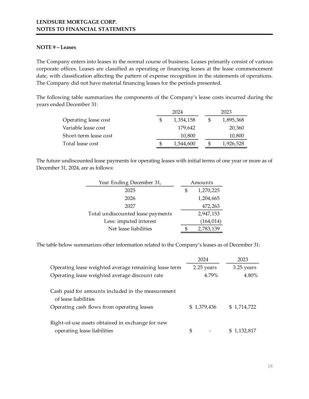 LENDSURE MORTGAGE CORP. NOTES TO FINANCIAL STATEMENTS 18 NOTE 9 – Leases The Company enters into leases in the normal course of business. Leases primarily consist of various corporate offices. Leases are classified as operating or financing leases at the lease commencement date, with classification affecting the pattern of expense recognition in the statements of operations. The Company did not have material financing leases for the periods presented. The following table summarizes the components of the Company’s lease costs incurred during the years ended December 31: The future undiscounted lease payments for operating leases with initial terms of one year or more as of December 31, 2024, are as follows: The table below summarizes other information related to the Company’s leases as of December 31: 2024 2023 Operating lease cost 1,354,158$ 1,895,368$ Variable lease cost 179,642 20,360 Short-term lease cost 10,800 10,800 Total lease cost 1,544,600$ 1,926,528$ Year Ending December 31, Amounts 2025 1,270,225$ 2026 1,204,665 2027 472,263 Total undiscounted lease payments 2,947,153 Less: imputed interest (164,014) Net lease liabilities 2,783,139$ 2024 2023 Operating lease weighted average remaining lease term 2.25 years 3.25 years Operating lease weighted average discount rate 4.79% 4.80% Cash paid for amounts included in the measurement of lease liabilities Operating cash flows from operating leases 1,379,436$ 1,714,722$ Right-of-use assets obtained in exchange for new operating lease liabilities -$ 1,132,817$