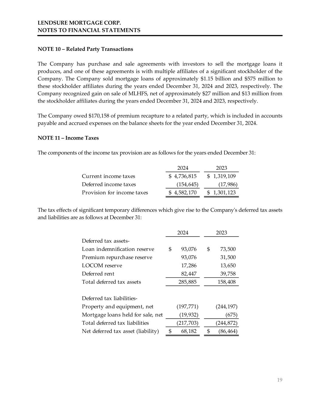 LENDSURE MORTGAGE CORP. NOTES TO FINANCIAL STATEMENTS 19 NOTE 10 – Related Party Transactions The Company has purchase and sale agreements with investors to sell the mortgage loans it produces, and one of these agreements is with multiple affiliates of a significant stockholder of the Company. The Company sold mortgage loans of approximately $1.15 billion and $575 million to these stockholder affiliates during the years ended December 31, 2024 and 2023, respectively. The Company recognized gain on sale of MLHFS, net of approximately $27 million and $13 million from the stockholder affiliates during the years ended December 31, 2024 and 2023, respectively. The Company owed $170,158 of premium recapture to a related party, which is included in accounts payable and accrued expenses on the balance sheets for the year ended December 31, 2024. NOTE 11 – Income Taxes The components of the income tax provision are as follows for the years ended December 31: The tax effects of significant temporary differences which give rise to the Company's deferred tax assets and liabilities are as follows at December 31: 2024 2023 Current income taxes 4,736,815$ 1,319,109$ Deferred income taxes (154,645) (17,986) Provision for income taxes 4,582,170$ 1,301,123$ 2024 2023 Deferred tax assets- Loan indemnification reserve 93,076$ 73,500$ Premium repurchase reserve 93,076 31,500 LOCOM reserve 17,286 13,650 Deferred rent 82,447 39,758 Total deferred tax assets 285,885 158,408 Deferred tax liabilities- Property and equipment, net (197,771) (244,197) Mortgage loans held for sale, net (19,932) (675) Total deferred tax liabilities (217,703) (244,872) Net deferred tax asset (liability) 68,182$ (86,464)$