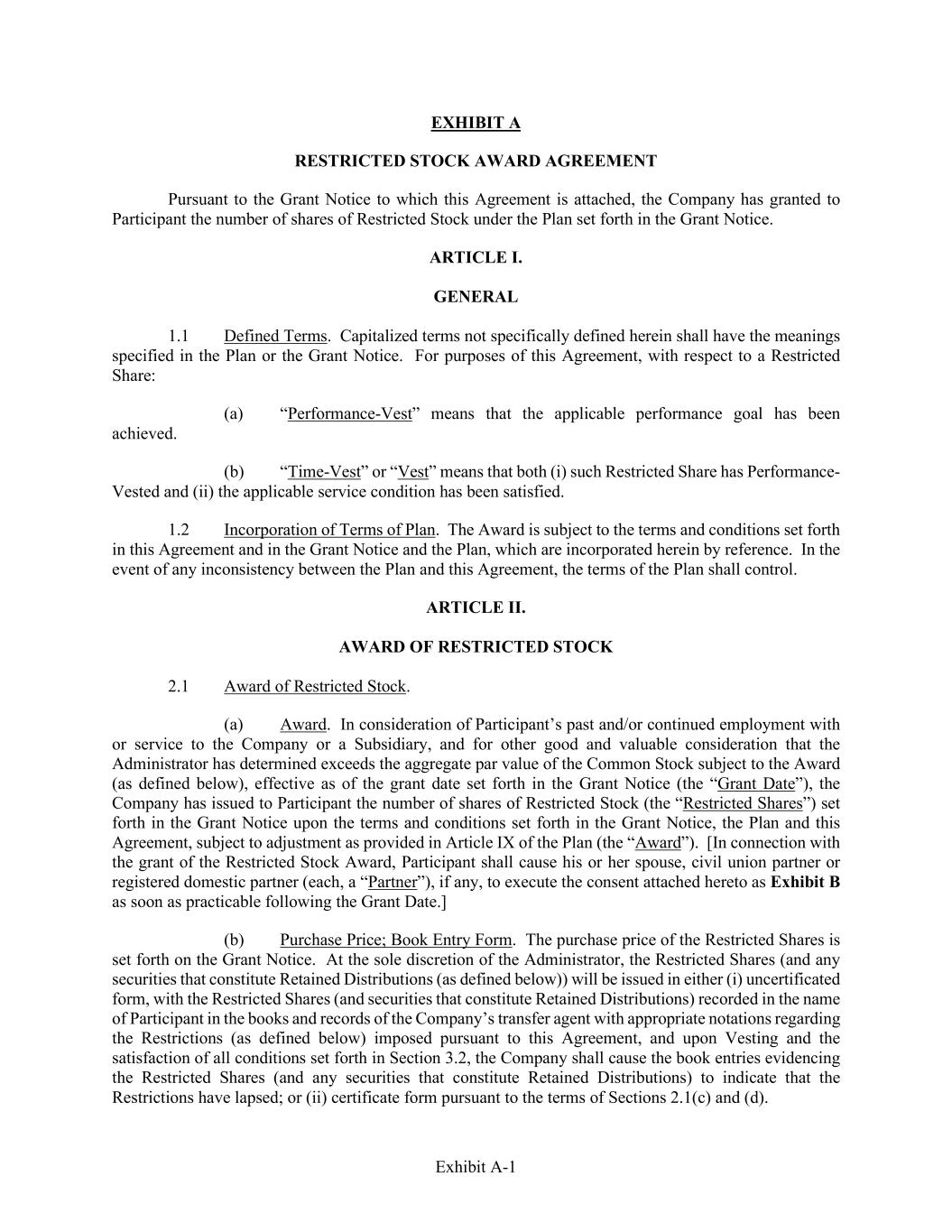 Exhibit A-1 EXHIBIT A RESTRICTED STOCK AWARD AGREEMENT Pursuant to the Grant Notice to which this Agreement is attached, the Company has granted to Participant the number of shares of Restricted Stock under the Plan set forth in the Grant Notice. ARTICLE I. GENERAL 1.1 Defined Terms. Capitalized terms not specifically defined herein shall have the meanings specified in the Plan or the Grant Notice. For purposes of this Agreement, with respect to a Restricted Share: (a) “Performance-Vest” means that the applicable performance goal has been achieved. (b) “Time-Vest” or “Vest” means that both (i) such Restricted Share has Performance- Vested and (ii) the applicable service condition has been satisfied. 1.2 Incorporation of Terms of Plan. The Award is subject to the terms and conditions set forth in this Agreement and in the Grant Notice and the Plan, which are incorporated herein by reference. In the event of any inconsistency between the Plan and this Agreement, the terms of the Plan shall control. ARTICLE II. AWARD OF RESTRICTED STOCK 2.1 Award of Restricted Stock. (a) Award. In consideration of Participant’s past and/or continued employment with or service to the Company or a Subsidiary, and for other good and valuable consideration that the Administrator has determined exceeds the aggregate par value of the Common Stock subject to the Award (as defined below), effective as of the grant date set forth in the Grant Notice (the “Grant Date”), the Company has issued to Participant the number of shares of Restricted Stock (the “Restricted Shares”) set forth in the Grant Notice upon the terms and conditions set forth in the Grant Notice, the Plan and this Agreement, subject to adjustment as provided in Article IX of the Plan (the “Award”). [In connection with the grant of the Restricted Stock Award, Participant shall cause his or her spouse, civil union partner or registered domestic partner (each, a “Partner”), if any, to execute the consent attached hereto as Exhibit B as soon as practicable following the Grant Date.] (b) Purchase Price; Book Entry Form. The purchase price of the Restricted Shares is set forth on the Grant Notice. At the sole discretion of the Administrator, the Restricted Shares (and any securities that constitute Retained Distributions (as defined below)) will be issued in either (i) uncertificated form, with the Restricted Shares (and securities that constitute Retained Distributions) recorded in the name of Participant in the books and records of the Company’s transfer agent with appropriate notations regarding the Restrictions (as defined below) imposed pursuant to this Agreement, and upon Vesting and the satisfaction of all conditions set forth in Section 3.2, the Company shall cause the book entries evidencing the Restricted Shares (and any securities that constitute Retained Distributions) to indicate that the Restrictions have lapsed; or (ii) certificate form pursuant to the terms of Sections 2.1(c) and (d).