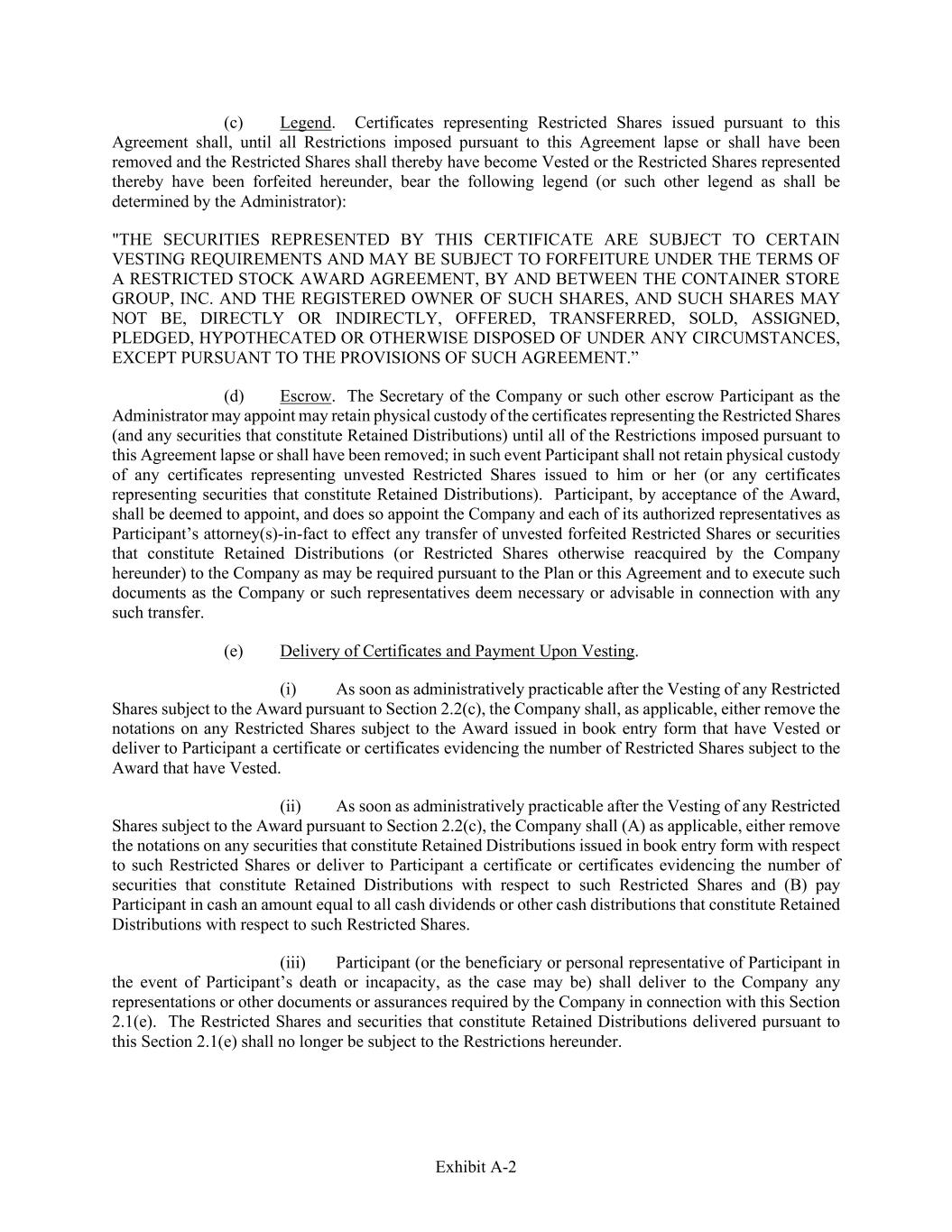 Exhibit A-2 (c) Legend. Certificates representing Restricted Shares issued pursuant to this Agreement shall, until all Restrictions imposed pursuant to this Agreement lapse or shall have been removed and the Restricted Shares shall thereby have become Vested or the Restricted Shares represented thereby have been forfeited hereunder, bear the following legend (or such other legend as shall be determined by the Administrator): "THE SECURITIES REPRESENTED BY THIS CERTIFICATE ARE SUBJECT TO CERTAIN VESTING REQUIREMENTS AND MAY BE SUBJECT TO FORFEITURE UNDER THE TERMS OF A RESTRICTED STOCK AWARD AGREEMENT, BY AND BETWEEN THE CONTAINER STORE GROUP, INC. AND THE REGISTERED OWNER OF SUCH SHARES, AND SUCH SHARES MAY NOT BE, DIRECTLY OR INDIRECTLY, OFFERED, TRANSFERRED, SOLD, ASSIGNED, PLEDGED, HYPOTHECATED OR OTHERWISE DISPOSED OF UNDER ANY CIRCUMSTANCES, EXCEPT PURSUANT TO THE PROVISIONS OF SUCH AGREEMENT.” (d) Escrow. The Secretary of the Company or such other escrow Participant as the Administrator may appoint may retain physical custody of the certificates representing the Restricted Shares (and any securities that constitute Retained Distributions) until all of the Restrictions imposed pursuant to this Agreement lapse or shall have been removed; in such event Participant shall not retain physical custody of any certificates representing unvested Restricted Shares issued to him or her (or any certificates representing securities that constitute Retained Distributions). Participant, by acceptance of the Award, shall be deemed to appoint, and does so appoint the Company and each of its authorized representatives as Participant’s attorney(s)-in-fact to effect any transfer of unvested forfeited Restricted Shares or securities that constitute Retained Distributions (or Restricted Shares otherwise reacquired by the Company hereunder) to the Company as may be required pursuant to the Plan or this Agreement and to execute such documents as the Company or such representatives deem necessary or advisable in connection with any such transfer. (e) Delivery of Certificates and Payment Upon Vesting. (i) As soon as administratively practicable after the Vesting of any Restricted Shares subject to the Award pursuant to Section 2.2(c), the Company shall, as applicable, either remove the notations on any Restricted Shares subject to the Award issued in book entry form that have Vested or deliver to Participant a certificate or certificates evidencing the number of Restricted Shares subject to the Award that have Vested. (ii) As soon as administratively practicable after the Vesting of any Restricted Shares subject to the Award pursuant to Section 2.2(c), the Company shall (A) as applicable, either remove the notations on any securities that constitute Retained Distributions issued in book entry form with respect to such Restricted Shares or deliver to Participant a certificate or certificates evidencing the number of securities that constitute Retained Distributions with respect to such Restricted Shares and (B) pay Participant in cash an amount equal to all cash dividends or other cash distributions that constitute Retained Distributions with respect to such Restricted Shares. (iii) Participant (or the beneficiary or personal representative of Participant in the event of Participant’s death or incapacity, as the case may be) shall deliver to the Company any representations or other documents or assurances required by the Company in connection with this Section 2.1(e). The Restricted Shares and securities that constitute Retained Distributions delivered pursuant to this Section 2.1(e) shall no longer be subject to the Restrictions hereunder.