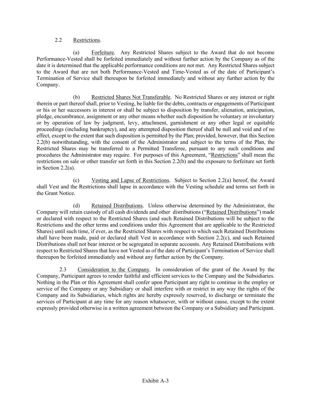 Exhibit A-3 2.2 Restrictions. (a) Forfeiture. Any Restricted Shares subject to the Award that do not become Performance-Vested shall be forfeited immediately and without further action by the Company as of the date it is determined that the applicable performance conditions are not met. Any Restricted Shares subject to the Award that are not both Performance-Vested and Time-Vested as of the date of Participant’s Termination of Service shall thereupon be forfeited immediately and without any further action by the Company. (b) Restricted Shares Not Transferable. No Restricted Shares or any interest or right therein or part thereof shall, prior to Vesting, be liable for the debts, contracts or engagements of Participant or his or her successors in interest or shall be subject to disposition by transfer, alienation, anticipation, pledge, encumbrance, assignment or any other means whether such disposition be voluntary or involuntary or by operation of law by judgment, levy, attachment, garnishment or any other legal or equitable proceedings (including bankruptcy), and any attempted disposition thereof shall be null and void and of no effect, except to the extent that such disposition is permitted by the Plan; provided, however, that this Section 2.2(b) notwithstanding, with the consent of the Administrator and subject to the terms of the Plan, the Restricted Shares may be transferred to a Permitted Transferee, pursuant to any such conditions and procedures the Administrator may require. For purposes of this Agreement, “Restrictions” shall mean the restrictions on sale or other transfer set forth in this Section 2.2(b) and the exposure to forfeiture set forth in Section 2.2(a). (c) Vesting and Lapse of Restrictions. Subject to Section 2.2(a) hereof, the Award shall Vest and the Restrictions shall lapse in accordance with the Vesting schedule and terms set forth in the Grant Notice. (d) Retained Distributions. Unless otherwise determined by the Administrator, the Company will retain custody of all cash dividends and other distributions (“Retained Distributions”) made or declared with respect to the Restricted Shares (and such Retained Distributions will be subject to the Restrictions and the other terms and conditions under this Agreement that are applicable to the Restricted Shares) until such time, if ever, as the Restricted Shares with respect to which such Retained Distributions shall have been made, paid or declared shall Vest in accordance with Section 2.2(c), and such Retained Distributions shall not bear interest or be segregated in separate accounts. Any Retained Distributions with respect to Restricted Shares that have not Vested as of the date of Participant’s Termination of Service shall thereupon be forfeited immediately and without any further action by the Company. 2.3 Consideration to the Company. In consideration of the grant of the Award by the Company, Participant agrees to render faithful and efficient services to the Company and the Subsidiaries. Nothing in the Plan or this Agreement shall confer upon Participant any right to continue in the employ or service of the Company or any Subsidiary or shall interfere with or restrict in any way the rights of the Company and its Subsidiaries, which rights are hereby expressly reserved, to discharge or terminate the services of Participant at any time for any reason whatsoever, with or without cause, except to the extent expressly provided otherwise in a written agreement between the Company or a Subsidiary and Participant.