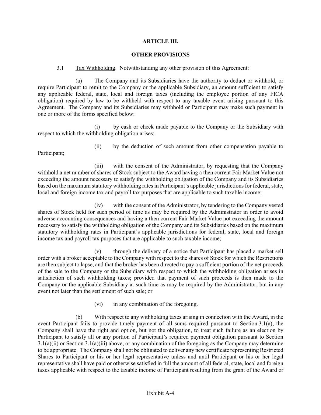 Exhibit A-4 ARTICLE III. OTHER PROVISIONS 3.1 Tax Withholding. Notwithstanding any other provision of this Agreement: (a) The Company and its Subsidiaries have the authority to deduct or withhold, or require Participant to remit to the Company or the applicable Subsidiary, an amount sufficient to satisfy any applicable federal, state, local and foreign taxes (including the employee portion of any FICA obligation) required by law to be withheld with respect to any taxable event arising pursuant to this Agreement. The Company and its Subsidiaries may withhold or Participant may make such payment in one or more of the forms specified below: (i) by cash or check made payable to the Company or the Subsidiary with respect to which the withholding obligation arises; (ii) by the deduction of such amount from other compensation payable to Participant; (iii) with the consent of the Administrator, by requesting that the Company withhold a net number of shares of Stock subject to the Award having a then current Fair Market Value not exceeding the amount necessary to satisfy the withholding obligation of the Company and its Subsidiaries based on the maximum statutory withholding rates in Participant’s applicable jurisdictions for federal, state, local and foreign income tax and payroll tax purposes that are applicable to such taxable income; (iv) with the consent of the Administrator, by tendering to the Company vested shares of Stock held for such period of time as may be required by the Administrator in order to avoid adverse accounting consequences and having a then current Fair Market Value not exceeding the amount necessary to satisfy the withholding obligation of the Company and its Subsidiaries based on the maximum statutory withholding rates in Participant’s applicable jurisdictions for federal, state, local and foreign income tax and payroll tax purposes that are applicable to such taxable income; (v) through the delivery of a notice that Participant has placed a market sell order with a broker acceptable to the Company with respect to the shares of Stock for which the Restrictions are then subject to lapse, and that the broker has been directed to pay a sufficient portion of the net proceeds of the sale to the Company or the Subsidiary with respect to which the withholding obligation arises in satisfaction of such withholding taxes; provided that payment of such proceeds is then made to the Company or the applicable Subsidiary at such time as may be required by the Administrator, but in any event not later than the settlement of such sale; or (vi) in any combination of the foregoing. (b) With respect to any withholding taxes arising in connection with the Award, in the event Participant fails to provide timely payment of all sums required pursuant to Section 3.1(a), the Company shall have the right and option, but not the obligation, to treat such failure as an election by Participant to satisfy all or any portion of Participant’s required payment obligation pursuant to Section 3.1(a)(ii) or Section 3.1(a)(iii) above, or any combination of the foregoing as the Company may determine to be appropriate. The Company shall not be obligated to deliver any new certificate representing Restricted Shares to Participant or his or her legal representative unless and until Participant or his or her legal representative shall have paid or otherwise satisfied in full the amount of all federal, state, local and foreign taxes applicable with respect to the taxable income of Participant resulting from the grant of the Award or