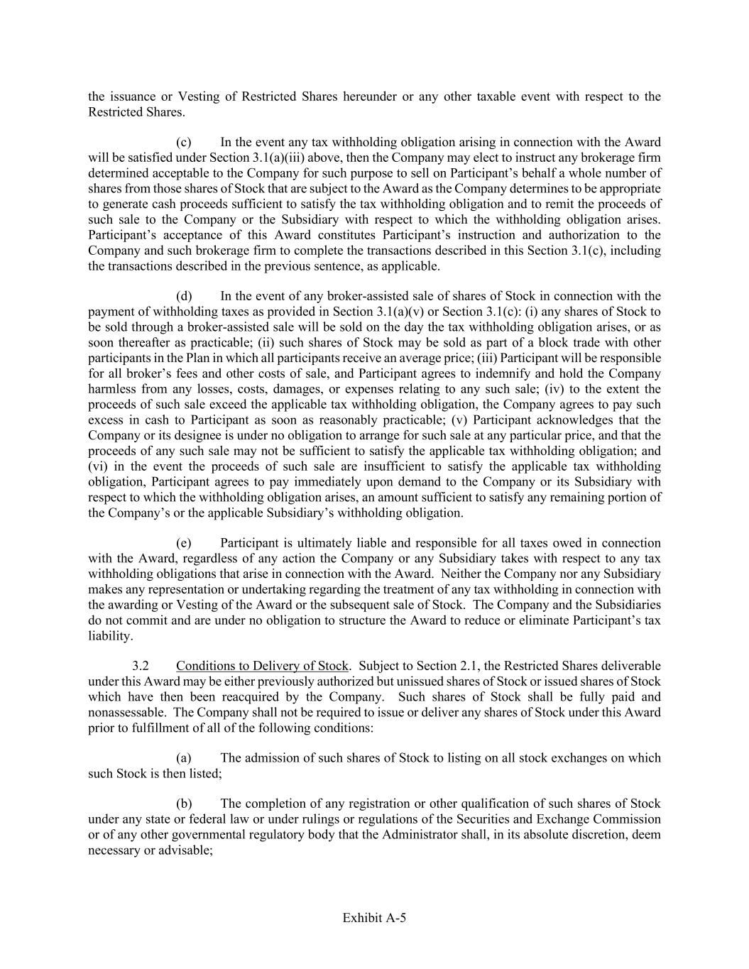 Exhibit A-5 the issuance or Vesting of Restricted Shares hereunder or any other taxable event with respect to the Restricted Shares. (c) In the event any tax withholding obligation arising in connection with the Award will be satisfied under Section 3.1(a)(iii) above, then the Company may elect to instruct any brokerage firm determined acceptable to the Company for such purpose to sell on Participant’s behalf a whole number of shares from those shares of Stock that are subject to the Award as the Company determines to be appropriate to generate cash proceeds sufficient to satisfy the tax withholding obligation and to remit the proceeds of such sale to the Company or the Subsidiary with respect to which the withholding obligation arises. Participant’s acceptance of this Award constitutes Participant’s instruction and authorization to the Company and such brokerage firm to complete the transactions described in this Section 3.1(c), including the transactions described in the previous sentence, as applicable. (d) In the event of any broker-assisted sale of shares of Stock in connection with the payment of withholding taxes as provided in Section 3.1(a)(v) or Section 3.1(c): (i) any shares of Stock to be sold through a broker-assisted sale will be sold on the day the tax withholding obligation arises, or as soon thereafter as practicable; (ii) such shares of Stock may be sold as part of a block trade with other participants in the Plan in which all participants receive an average price; (iii) Participant will be responsible for all broker’s fees and other costs of sale, and Participant agrees to indemnify and hold the Company harmless from any losses, costs, damages, or expenses relating to any such sale; (iv) to the extent the proceeds of such sale exceed the applicable tax withholding obligation, the Company agrees to pay such excess in cash to Participant as soon as reasonably practicable; (v) Participant acknowledges that the Company or its designee is under no obligation to arrange for such sale at any particular price, and that the proceeds of any such sale may not be sufficient to satisfy the applicable tax withholding obligation; and (vi) in the event the proceeds of such sale are insufficient to satisfy the applicable tax withholding obligation, Participant agrees to pay immediately upon demand to the Company or its Subsidiary with respect to which the withholding obligation arises, an amount sufficient to satisfy any remaining portion of the Company’s or the applicable Subsidiary’s withholding obligation. (e) Participant is ultimately liable and responsible for all taxes owed in connection with the Award, regardless of any action the Company or any Subsidiary takes with respect to any tax withholding obligations that arise in connection with the Award. Neither the Company nor any Subsidiary makes any representation or undertaking regarding the treatment of any tax withholding in connection with the awarding or Vesting of the Award or the subsequent sale of Stock. The Company and the Subsidiaries do not commit and are under no obligation to structure the Award to reduce or eliminate Participant’s tax liability. 3.2 Conditions to Delivery of Stock. Subject to Section 2.1, the Restricted Shares deliverable under this Award may be either previously authorized but unissued shares of Stock or issued shares of Stock which have then been reacquired by the Company. Such shares of Stock shall be fully paid and nonassessable. The Company shall not be required to issue or deliver any shares of Stock under this Award prior to fulfillment of all of the following conditions: (a) The admission of such shares of Stock to listing on all stock exchanges on which such Stock is then listed; (b) The completion of any registration or other qualification of such shares of Stock under any state or federal law or under rulings or regulations of the Securities and Exchange Commission or of any other governmental regulatory body that the Administrator shall, in its absolute discretion, deem necessary or advisable;