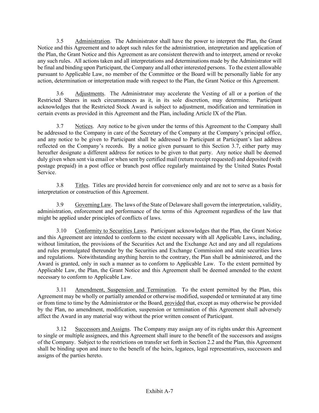 Exhibit A-7 3.5 Administration. The Administrator shall have the power to interpret the Plan, the Grant Notice and this Agreement and to adopt such rules for the administration, interpretation and application of the Plan, the Grant Notice and this Agreement as are consistent therewith and to interpret, amend or revoke any such rules. All actions taken and all interpretations and determinations made by the Administrator will be final and binding upon Participant, the Company and all other interested persons. To the extent allowable pursuant to Applicable Law, no member of the Committee or the Board will be personally liable for any action, determination or interpretation made with respect to the Plan, the Grant Notice or this Agreement. 3.6 Adjustments. The Administrator may accelerate the Vesting of all or a portion of the Restricted Shares in such circumstances as it, in its sole discretion, may determine. Participant acknowledges that the Restricted Stock Award is subject to adjustment, modification and termination in certain events as provided in this Agreement and the Plan, including Article IX of the Plan. 3.7 Notices. Any notice to be given under the terms of this Agreement to the Company shall be addressed to the Company in care of the Secretary of the Company at the Company’s principal office, and any notice to be given to Participant shall be addressed to Participant at Participant’s last address reflected on the Company’s records. By a notice given pursuant to this Section 3.7, either party may hereafter designate a different address for notices to be given to that party. Any notice shall be deemed duly given when sent via email or when sent by certified mail (return receipt requested) and deposited (with postage prepaid) in a post office or branch post office regularly maintained by the United States Postal Service. 3.8 Titles. Titles are provided herein for convenience only and are not to serve as a basis for interpretation or construction of this Agreement. 3.9 Governing Law. The laws of the State of Delaware shall govern the interpretation, validity, administration, enforcement and performance of the terms of this Agreement regardless of the law that might be applied under principles of conflicts of laws. 3.10 Conformity to Securities Laws. Participant acknowledges that the Plan, the Grant Notice and this Agreement are intended to conform to the extent necessary with all Applicable Laws, including, without limitation, the provisions of the Securities Act and the Exchange Act and any and all regulations and rules promulgated thereunder by the Securities and Exchange Commission and state securities laws and regulations. Notwithstanding anything herein to the contrary, the Plan shall be administered, and the Award is granted, only in such a manner as to conform to Applicable Law. To the extent permitted by Applicable Law, the Plan, the Grant Notice and this Agreement shall be deemed amended to the extent necessary to conform to Applicable Law. 3.11 Amendment, Suspension and Termination. To the extent permitted by the Plan, this Agreement may be wholly or partially amended or otherwise modified, suspended or terminated at any time or from time to time by the Administrator or the Board, provided that, except as may otherwise be provided by the Plan, no amendment, modification, suspension or termination of this Agreement shall adversely affect the Award in any material way without the prior written consent of Participant. 3.12 Successors and Assigns. The Company may assign any of its rights under this Agreement to single or multiple assignees, and this Agreement shall inure to the benefit of the successors and assigns of the Company. Subject to the restrictions on transfer set forth in Section 2.2 and the Plan, this Agreement shall be binding upon and inure to the benefit of the heirs, legatees, legal representatives, successors and assigns of the parties hereto.