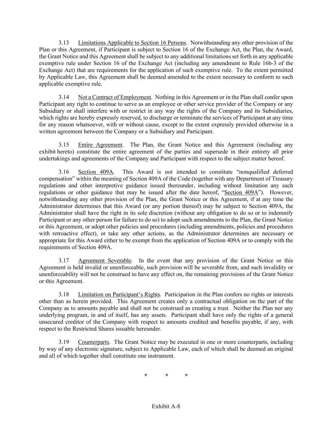 Exhibit A-8 3.13 Limitations Applicable to Section 16 Persons. Notwithstanding any other provision of the Plan or this Agreement, if Participant is subject to Section 16 of the Exchange Act, the Plan, the Award, the Grant Notice and this Agreement shall be subject to any additional limitations set forth in any applicable exemptive rule under Section 16 of the Exchange Act (including any amendment to Rule 16b-3 of the Exchange Act) that are requirements for the application of such exemptive rule. To the extent permitted by Applicable Law, this Agreement shall be deemed amended to the extent necessary to conform to such applicable exemptive rule. 3.14 Not a Contract of Employment. Nothing in this Agreement or in the Plan shall confer upon Participant any right to continue to serve as an employee or other service provider of the Company or any Subsidiary or shall interfere with or restrict in any way the rights of the Company and its Subsidiaries, which rights are hereby expressly reserved, to discharge or terminate the services of Participant at any time for any reason whatsoever, with or without cause, except to the extent expressly provided otherwise in a written agreement between the Company or a Subsidiary and Participant. 3.15 Entire Agreement. The Plan, the Grant Notice and this Agreement (including any exhibit hereto) constitute the entire agreement of the parties and supersede in their entirety all prior undertakings and agreements of the Company and Participant with respect to the subject matter hereof. 3.16 Section 409A. This Award is not intended to constitute “nonqualified deferred compensation” within the meaning of Section 409A of the Code (together with any Department of Treasury regulations and other interpretive guidance issued thereunder, including without limitation any such regulations or other guidance that may be issued after the date hereof, “Section 409A”). However, notwithstanding any other provision of the Plan, the Grant Notice or this Agreement, if at any time the Administrator determines that this Award (or any portion thereof) may be subject to Section 409A, the Administrator shall have the right in its sole discretion (without any obligation to do so or to indemnify Participant or any other person for failure to do so) to adopt such amendments to the Plan, the Grant Notice or this Agreement, or adopt other policies and procedures (including amendments, policies and procedures with retroactive effect), or take any other actions, as the Administrator determines are necessary or appropriate for this Award either to be exempt from the application of Section 409A or to comply with the requirements of Section 409A. 3.17 Agreement Severable. In the event that any provision of the Grant Notice or this Agreement is held invalid or unenforceable, such provision will be severable from, and such invalidity or unenforceability will not be construed to have any effect on, the remaining provisions of the Grant Notice or this Agreement. 3.18 Limitation on Participant’s Rights. Participation in the Plan confers no rights or interests other than as herein provided. This Agreement creates only a contractual obligation on the part of the Company as to amounts payable and shall not be construed as creating a trust. Neither the Plan nor any underlying program, in and of itself, has any assets. Participant shall have only the rights of a general unsecured creditor of the Company with respect to amounts credited and benefits payable, if any, with respect to the Restricted Shares issuable hereunder. 3.19 Counterparts. The Grant Notice may be executed in one or more counterparts, including by way of any electronic signature, subject to Applicable Law, each of which shall be deemed an original and all of which together shall constitute one instrument. * * *