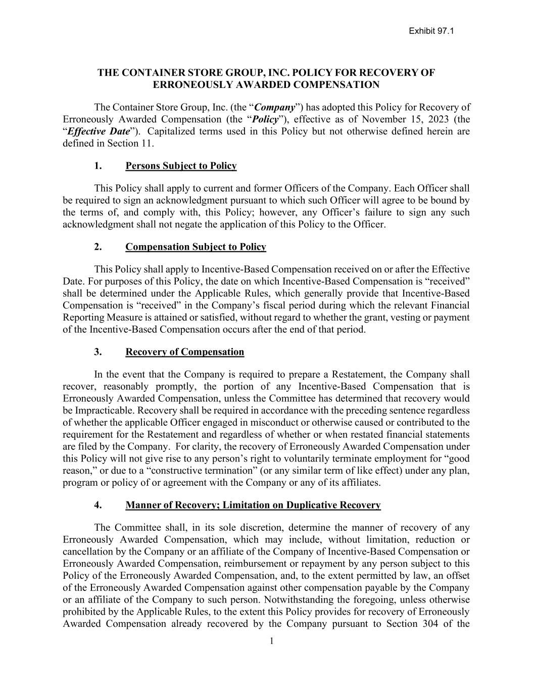 1 THE CONTAINER STORE GROUP, INC. POLICY FOR RECOVERY OF ERRONEOUSLY AWARDED COMPENSATION The Container Store Group, Inc. (the “Company”) has adopted this Policy for Recovery of Erroneously Awarded Compensation (the “Policy”), effective as of November 15, 2023 (the “Effective Date”). Capitalized terms used in this Policy but not otherwise defined herein are defined in Section 11. 1. Persons Subject to Policy This Policy shall apply to current and former Officers of the Company. Each Officer shall be required to sign an acknowledgment pursuant to which such Officer will agree to be bound by the terms of, and comply with, this Policy; however, any Officer’s failure to sign any such acknowledgment shall not negate the application of this Policy to the Officer. 2. Compensation Subject to Policy This Policy shall apply to Incentive-Based Compensation received on or after the Effective Date. For purposes of this Policy, the date on which Incentive-Based Compensation is “received” shall be determined under the Applicable Rules, which generally provide that Incentive-Based Compensation is “received” in the Company’s fiscal period during which the relevant Financial Reporting Measure is attained or satisfied, without regard to whether the grant, vesting or payment of the Incentive-Based Compensation occurs after the end of that period. 3. Recovery of Compensation In the event that the Company is required to prepare a Restatement, the Company shall recover, reasonably promptly, the portion of any Incentive-Based Compensation that is Erroneously Awarded Compensation, unless the Committee has determined that recovery would be Impracticable. Recovery shall be required in accordance with the preceding sentence regardless of whether the applicable Officer engaged in misconduct or otherwise caused or contributed to the requirement for the Restatement and regardless of whether or when restated financial statements are filed by the Company. For clarity, the recovery of Erroneously Awarded Compensation under this Policy will not give rise to any person’s right to voluntarily terminate employment for “good reason,” or due to a “constructive termination” (or any similar term of like effect) under any plan, program or policy of or agreement with the Company or any of its affiliates. 4. Manner of Recovery; Limitation on Duplicative Recovery The Committee shall, in its sole discretion, determine the manner of recovery of any Erroneously Awarded Compensation, which may include, without limitation, reduction or cancellation by the Company or an affiliate of the Company of Incentive-Based Compensation or Erroneously Awarded Compensation, reimbursement or repayment by any person subject to this Policy of the Erroneously Awarded Compensation, and, to the extent permitted by law, an offset of the Erroneously Awarded Compensation against other compensation payable by the Company or an affiliate of the Company to such person. Notwithstanding the foregoing, unless otherwise prohibited by the Applicable Rules, to the extent this Policy provides for recovery of Erroneously Awarded Compensation already recovered by the Company pursuant to Section 304 of the Exhibit 97.1