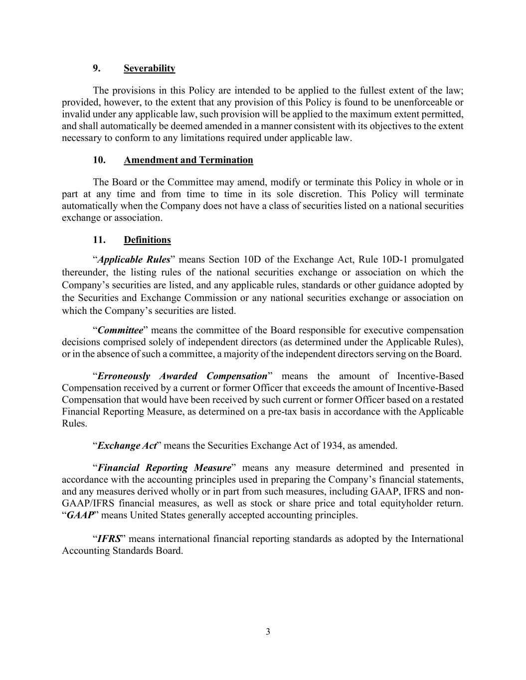 3 9. Severability The provisions in this Policy are intended to be applied to the fullest extent of the law; provided, however, to the extent that any provision of this Policy is found to be unenforceable or invalid under any applicable law, such provision will be applied to the maximum extent permitted, and shall automatically be deemed amended in a manner consistent with its objectives to the extent necessary to conform to any limitations required under applicable law. 10. Amendment and Termination The Board or the Committee may amend, modify or terminate this Policy in whole or in part at any time and from time to time in its sole discretion. This Policy will terminate automatically when the Company does not have a class of securities listed on a national securities exchange or association. 11. Definitions “Applicable Rules” means Section 10D of the Exchange Act, Rule 10D-1 promulgated thereunder, the listing rules of the national securities exchange or association on which the Company’s securities are listed, and any applicable rules, standards or other guidance adopted by the Securities and Exchange Commission or any national securities exchange or association on which the Company’s securities are listed. “Committee” means the committee of the Board responsible for executive compensation decisions comprised solely of independent directors (as determined under the Applicable Rules), or in the absence of such a committee, a majority of the independent directors serving on the Board. “Erroneously Awarded Compensation” means the amount of Incentive-Based Compensation received by a current or former Officer that exceeds the amount of Incentive-Based Compensation that would have been received by such current or former Officer based on a restated Financial Reporting Measure, as determined on a pre-tax basis in accordance with the Applicable Rules. “Exchange Act” means the Securities Exchange Act of 1934, as amended. “Financial Reporting Measure” means any measure determined and presented in accordance with the accounting principles used in preparing the Company’s financial statements, and any measures derived wholly or in part from such measures, including GAAP, IFRS and non- GAAP/IFRS financial measures, as well as stock or share price and total equityholder return. “GAAP” means United States generally accepted accounting principles. “IFRS” means international financial reporting standards as adopted by the International Accounting Standards Board.