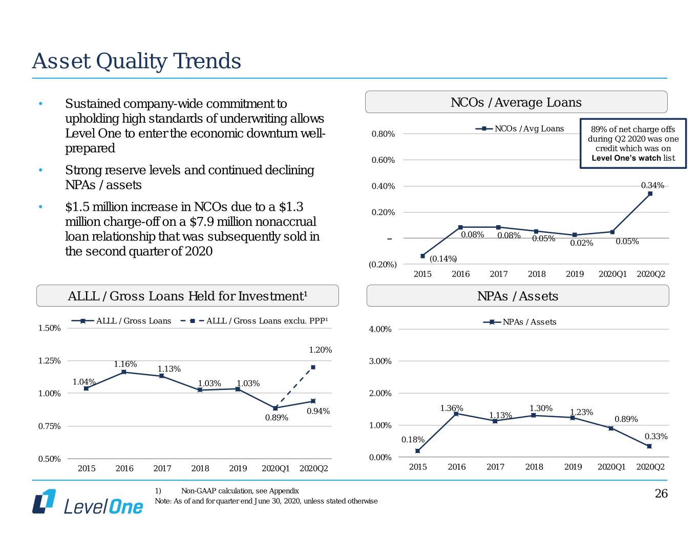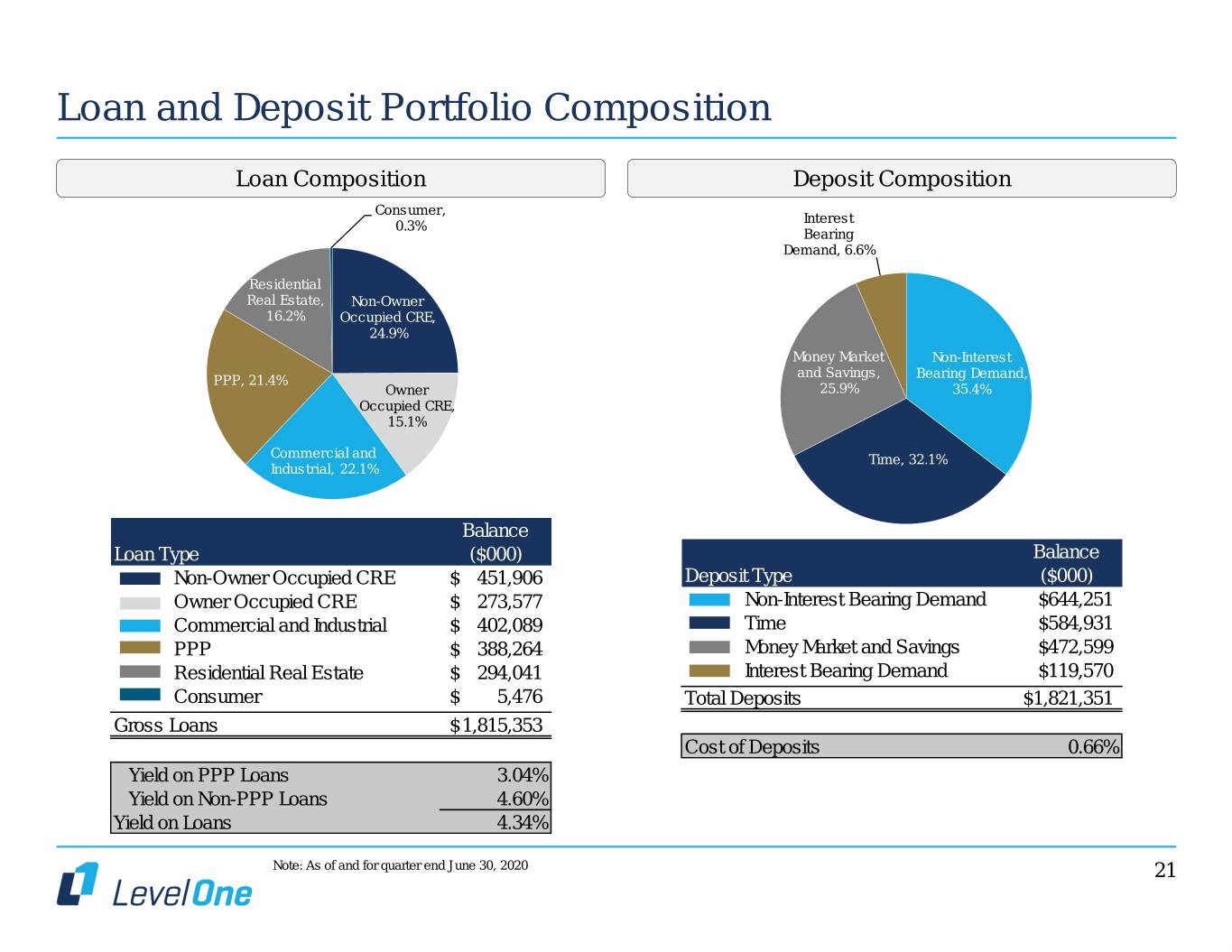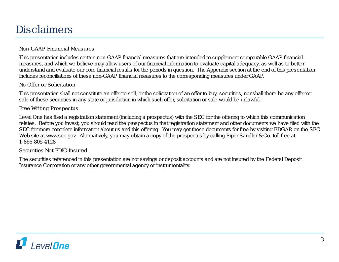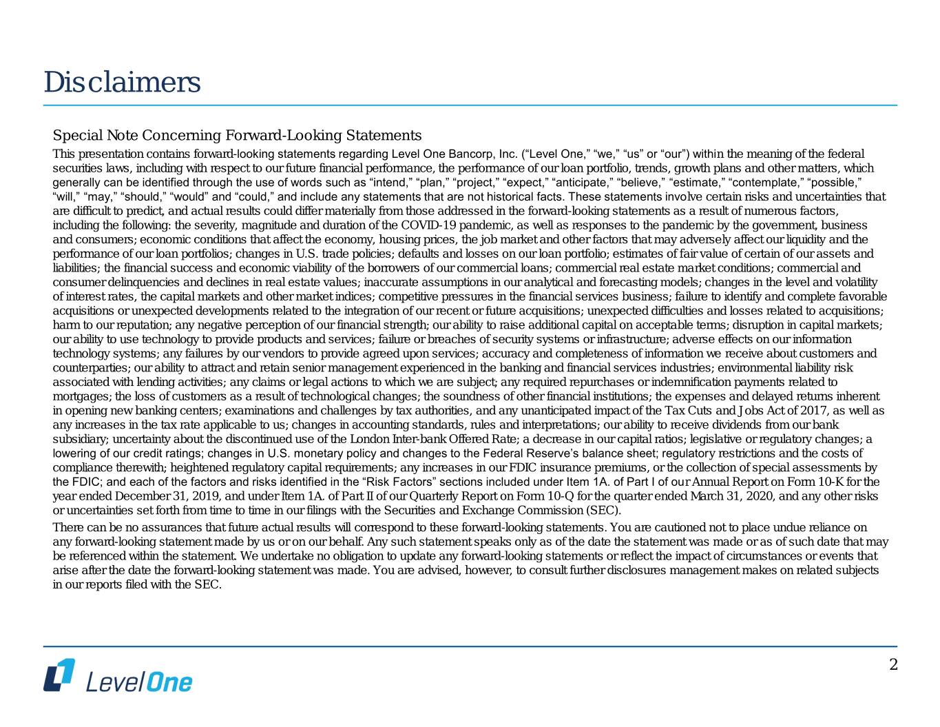 Disclaimers Special Note Concerning Forward-Looking Statements This presentation contains forward-looking statements regarding Level One Bancorp, Inc. (“Level One,” “we,” “us” or “our”) within the meaning of the federal securities laws, including with respect to our future financial performance, the performance of our loan portfolio, trends, growth plans and other matters, which generally can be identified through the use of words such as “intend,” “plan,” “project,” “expect,” “anticipate,” “believe,” “estimate,” “contemplate,” “possible,” “will,” “may,” “should,” “would” and “could,” and include any statements that are not historical facts. These statements involve certain risks and uncertainties that are difficult to predict, and actual results could differ materially from those addressed in the forward-looking statements as a result of numerous factors, including the following: the severity, magnitude and duration of the COVID-19 pandemic, as well as responses to the pandemic by the government, business and consumers; economic conditions that affect the economy, housing prices, the job market and other factors that may adversely affect our liquidity and the performance of our loan portfolios; changes in U.S. trade policies; defaults and losses on our loan portfolio; estimates of fair value of certain of our assets and liabilities; the financial success and economic viability of the borrowers of our commercial loans; commercial real estate market conditions; commercial and consumer delinquencies and declines in real estate values; inaccurate assumptions in our analytical and forecasting models; changes in the level and volatility of interest rates, the capital markets and other market indices; competitive pressures in the financial services business; failure to identify and complete favorable acquisitions or unexpected developments related to the integration of our recent or future acquisitions; unexpected difficulties and losses related to acquisitions; harm to our reputation; any negative perception of our financial strength; our ability to raise additional capital on acceptable terms; disruption in capital markets; our ability to use technology to provide products and services; failure or breaches of security systems or infrastructure; adverse effects on our information technology systems; any failures by our vendors to provide agreed upon services; accuracy and completeness of information we receive about customers and counterparties; our ability to attract and retain senior management experienced in the banking and financial services industries; environmental liability risk associated with lending activities; any claims or legal actions to which we are subject; any required repurchases or indemnification payments related to mortgages; the loss of customers as a result of technological changes; the soundness of other financial institutions; the expenses and delayed returns inherent in opening new banking centers; examinations and challenges by tax authorities, and any unanticipated impact of the Tax Cuts and Jobs Act of 2017, as well as any increases in the tax rate applicable to us; changes in accounting standards, rules and interpretations; our ability to receive dividends from our bank subsidiary; uncertainty about the discontinued use of the London Inter-bank Offered Rate; a decrease in our capital ratios; legislative or regulatory changes; a lowering of our credit ratings; changes in U.S. monetary policy and changes to the Federal Reserve’s balance sheet; regulatory restrictions and the costs of compliance therewith; heightened regulatory capital requirements; any increases in our FDIC insurance premiums, or the collection of special assessments by the FDIC; and each of the factors and risks identified in the “Risk Factors” sections included under Item 1A. of Part I of our Annual Report on Form 10-K for the year ended December 31, 2019, and under Item 1A. of Part II of our Quarterly Report on Form 10-Q for the quarter ended March 31, 2020, and any other risks or uncertainties set forth from time to time in our filings with the Securities and Exchange Commission (SEC). There can be no assurances that future actual results will correspond to these forward-looking statements. You are cautioned not to place undue reliance on any forward-looking statement made by us or on our behalf. Any such statement speaks only as of the date the statement was made or as of such date that may be referenced within the statement. We undertake no obligation to update any forward-looking statements or reflect the impact of circumstances or events that arise after the date the forward-looking statement was made. You are advised, however, to consult further disclosures management makes on related subjects in our reports filed with the SEC. 2