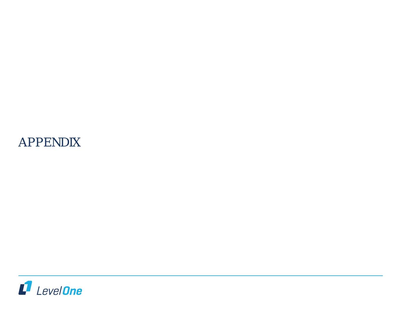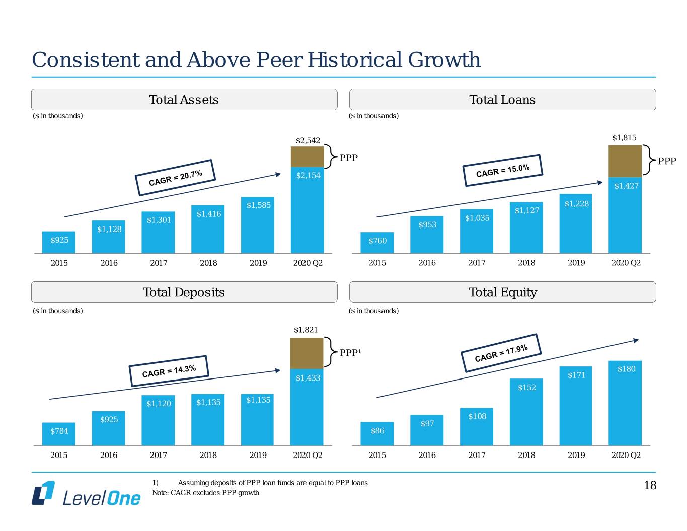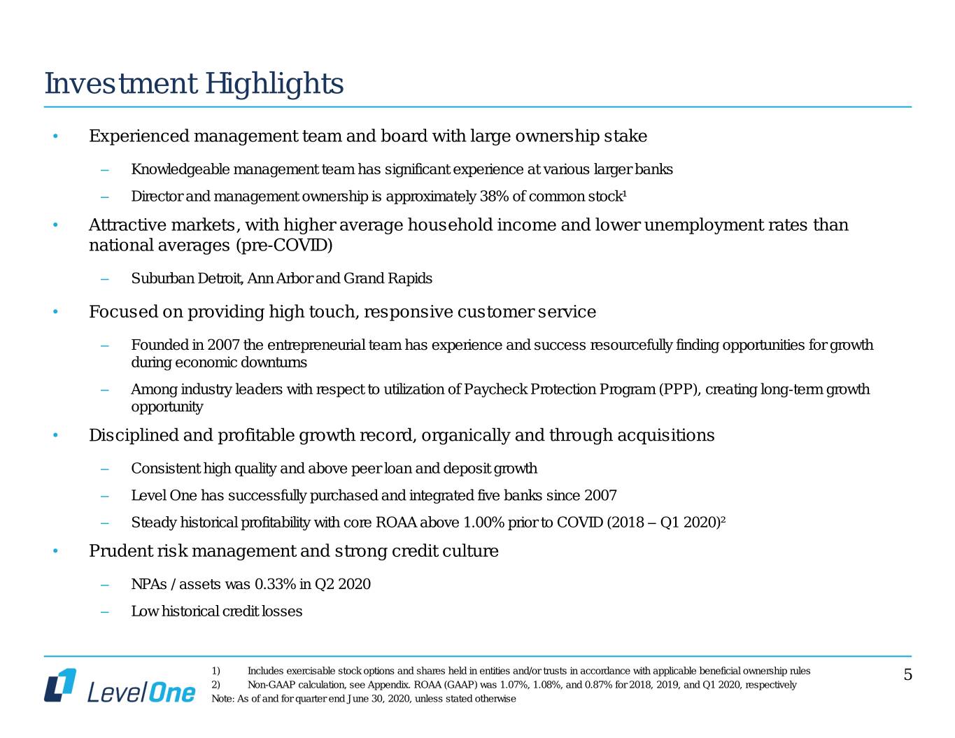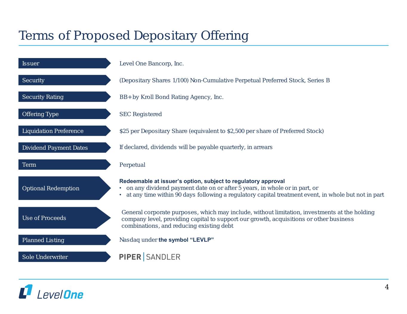 Disclaimers Non-GAAP Financial Measures This presentation includes certain non-GAAP financial measures that are intended to supplement comparable GAAP financial measures, and which we believe may allow users of our financial information to evaluate capital adequacy, as well as to better understand and evaluate our core financial results for the periods in question. The Appendix section at the end of this presentation includes reconciliations of these non-GAAP financial measures to the corresponding measures under GAAP. No Offer or Solicitation This presentation shall not constitute an offer to sell, or the solicitation of an offer to buy, securities, nor shall there be any offer or sale of these securities in any state or jurisdiction in which such offer, solicitation or sale would be unlawful. Free Writing Prospectus Level One has filed a registration statement (including a prospectus) with the SEC for the offering to which this communication relates. Before you invest, you should read the prospectus in that registration statement and other documents we have filed with the SEC for more complete information about us and this offering. You may get these documents for free by visiting EDGAR on the SEC Web site at www.sec.gov. Alternatively, you may obtain a copy of the prospectus by calling Piper Sandler & Co. toll free at 1-866-805-4128 Securities Not FDIC-Insured The securities referenced in this presentation are not savings or deposit accounts and are not insured by the Federal Deposit Insurance Corporation or any other governmental agency or instrumentality. 3