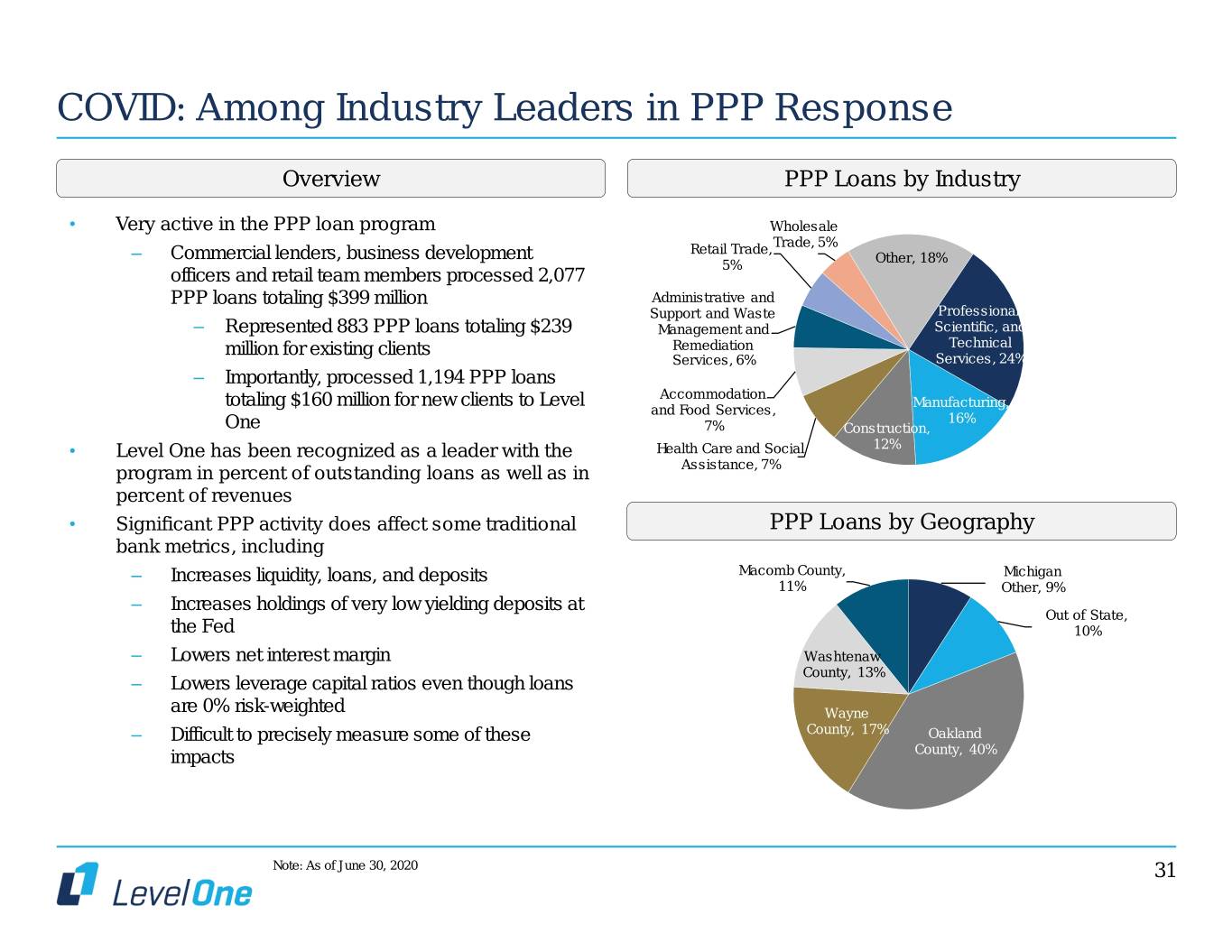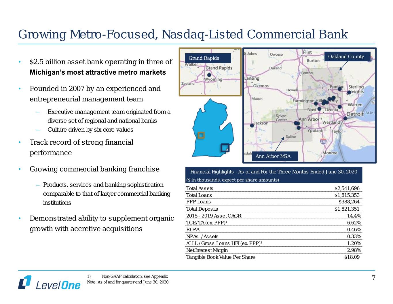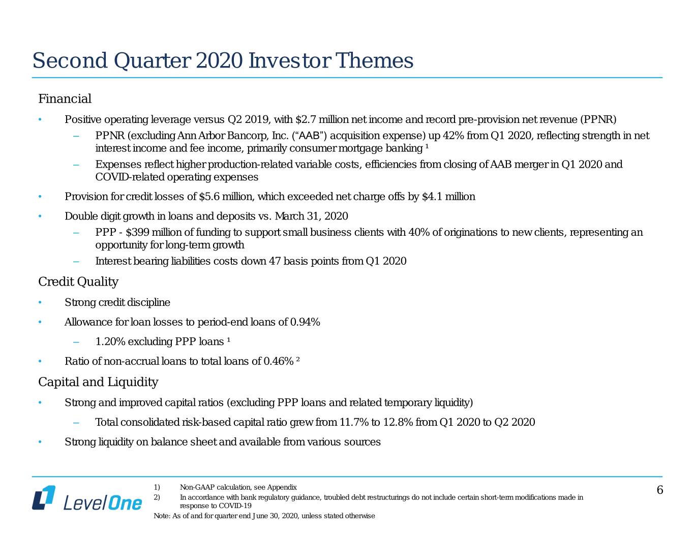 Second Quarter 2020 Investor Themes Financial • Positive operating leverage versus Q2 2019, with $2.7 million net income and record pre-provision net revenue (PPNR) – PPNR (excluding Ann Arbor Bancorp, Inc. (“AAB”) acquisition expense) up 42% from Q1 2020, reflecting strength in net interest income and fee income, primarily consumer mortgage banking ¹ – Expenses reflect higher production-related variable costs, efficiencies from closing of AAB merger in Q1 2020 and COVID-related operating expenses • Provision for credit losses of $5.6 million, which exceeded net charge offs by $4.1 million • Double digit growth in loans and deposits vs. March 31, 2020 – PPP - $399 million of funding to support small business clients with 40% of originations to new clients, representing an opportunity for long-term growth – Interest bearing liabilities costs down 47 basis points from Q1 2020 Credit Quality • Strong credit discipline • Allowance for loan losses to period-end loans of 0.94% – 1.20% excluding PPP loans ¹ • Ratio of non-accrual loans to total loans of 0.46% ² Capital and Liquidity • Strong and improved capital ratios (excluding PPP loans and related temporary liquidity) – Total consolidated risk-based capital ratio grew from 11.7% to 12.8% from Q1 2020 to Q2 2020 • Strong liquidity on balance sheet and available from various sources 1) Non-GAAP calculation, see Appendix 6 2) In accordance with bank regulatory guidance, troubled debt restructurings do not include certain short-term modifications made in response to COVID-19 Note: As of and for quarter end June 30, 2020, unless stated otherwise