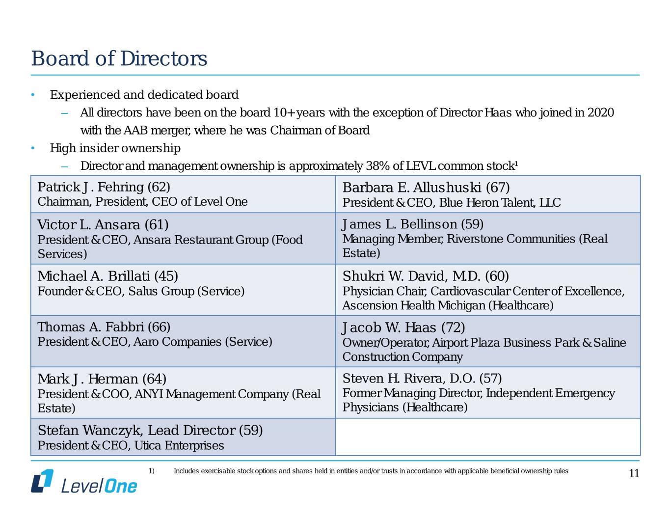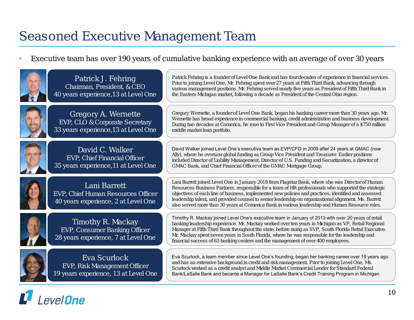 Seasoned Executive Management Team • Executive team has over 190 years of cumulative banking experience with an average of over 30 years Patrick J. Fehring Patrick Fehring is a founder of Level One Bank and has four decades of experience in financial services. Prior to joining Level One, Mr. Fehring spent over 27 years at Fifth Third Bank, advancing through Chairman, President, & CEO various management positions. Mr. Fehring served nearly five years as President of Fifth Third Bank in 40 years experience,13 at Level One the Eastern Michigan market, following a decade as President of the Central Ohio region. Gregory A. Wernette Gregory Wernette, a founder of Level One Bank, began his banking career more than 30 years ago. Mr. Wernette has broad experience in commercial banking, credit administration and business development. EVP, CLO & Corporate Secretary During two decades at Comerica, he rose to First Vice President and Group Manager of a $750 million 33 years experience,13 at Level One middle market loan portfolio. David C. Walker David Walker joined Level One’s executive team as EVP/CFO in 2009 after 24 years at GMAC (now Ally), where he oversaw global funding as Group Vice President and Treasurer. Earlier positions EVP, Chief Financial Officer included Director of Liability Management, Director of U.S. Funding and Securitization, a director of 35 years experience,11 at Level One GMAC Bank, and Chief Financial Officer of the GMAC Mortgage Group. Lani Barrett joined Level One in January 2018 from Flagstar Bank, where she was Director of Human Lani Barrett Resources Business Partners, responsible for a team of HR professionals who supported the strategic EVP, Chief Human Resources Officer objectives of each line of business, implemented new policies and practices, identified and assessed 40 years experience, 2 at Level One leadership talent, and provided counsel to senior leadership on organizational alignment. Ms. Barrett also served more than 30 years at Comerica Bank in various leadership and Human Resource roles. Timothy R. Mackay joined Level One’s executive team in January of 2013 with over 20 years of retail Timothy R. Mackay banking leadership experience. Mr. Mackay worked over ten years in Michigan as VP, Retail Regional EVP, Consumer Banking Officer Manager at Fifth Third Bank throughout the state, before rising as SVP, South Florida Retail Executive. 28 years experience, 7 at Level One Mr. Mackay spent seven years in South Florida, where he was responsible for the leadership and financial success of 63 banking centers and the management of over 400 employees. Eva Scurlock Eva Scurlock, a team member since Level One’s founding, began her banking career over 19 years ago and has an extensive background in credit and risk management. Prior to joining Level One, Ms. EVP, Risk Management Officer Scurlock worked as a credit analyst and Middle Market Commercial Lender for Standard Federal 19 years experience, 13 at Level One Bank/LaSalle Bank and became a Manager for LaSalle Bank’s Credit Training Program in Michigan. 10