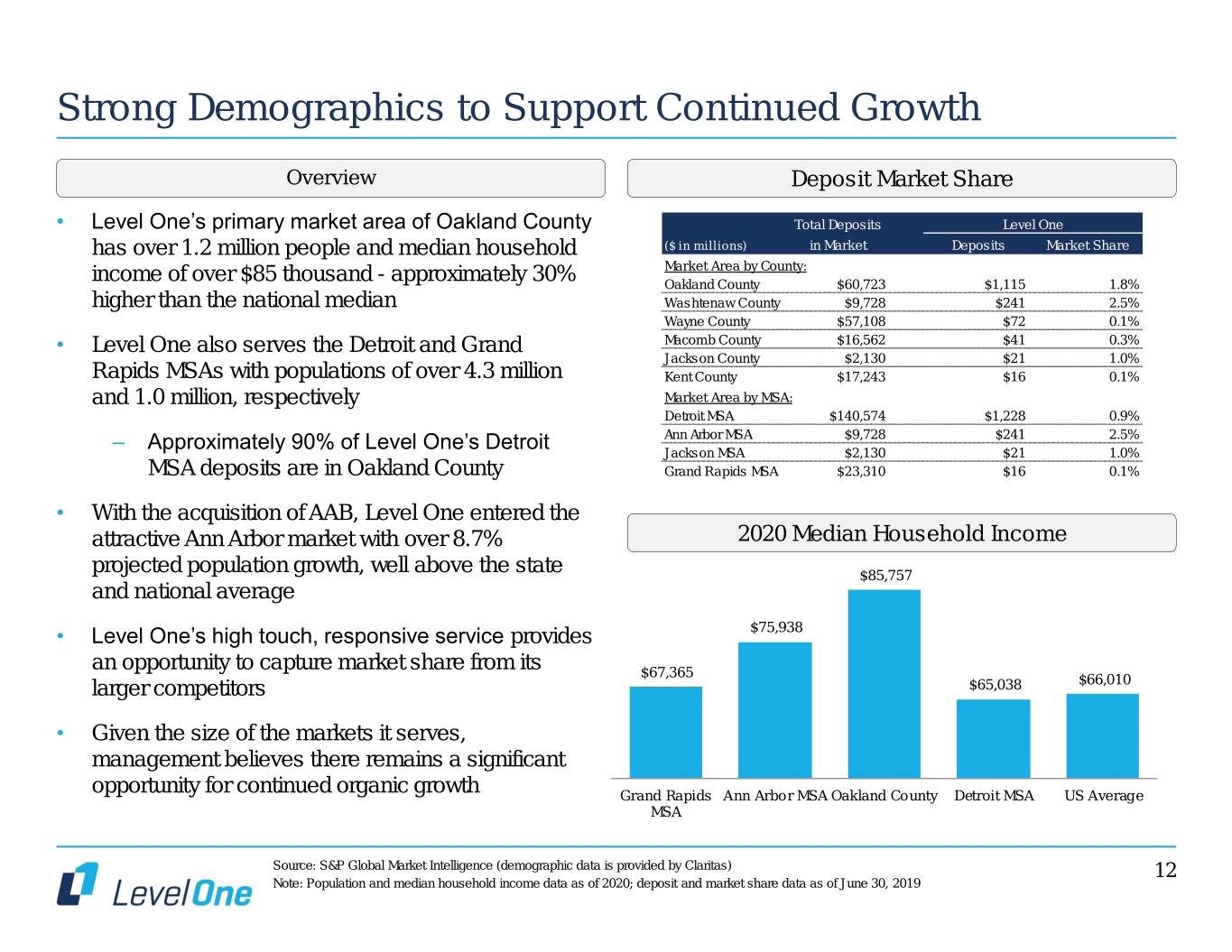 Board of Directors • Experienced and dedicated board – All directors have been on the board 10+ years with the exception of Director Haas who joined in 2020 with the AAB merger, where he was Chairman of Board • High insider ownership – Director and management ownership is approximately 38% of LEVL common stock¹ Patrick J. Fehring (62) Barbara E. Allushuski (67) Chairman, President, CEO of Level One President & CEO, Blue Heron Talent, LLC Victor L. Ansara (61) James L. Bellinson (59) President & CEO, Ansara Restaurant Group (Food Managing Member, Riverstone Communities (Real Services) Estate) Michael A. Brillati (45) Shukri W. David, M.D. (60) Founder & CEO, Salus Group (Service) Physician Chair, Cardiovascular Center of Excellence, Ascension Health Michigan (Healthcare) Thomas A. Fabbri (66) Jacob W. Haas (72) President & CEO, Aaro Companies (Service) Owner/Operator, Airport Plaza Business Park & Saline Construction Company Mark J. Herman (64) Steven H. Rivera, D.O. (57) President & COO, ANYI Management Company (Real Former Managing Director, Independent Emergency Estate) Physicians (Healthcare) Stefan Wanczyk, Lead Director (59) President & CEO, Utica Enterprises 1) Includes exercisable stock options and shares held in entities and/or trusts in accordance with applicable beneficial ownership rules 11