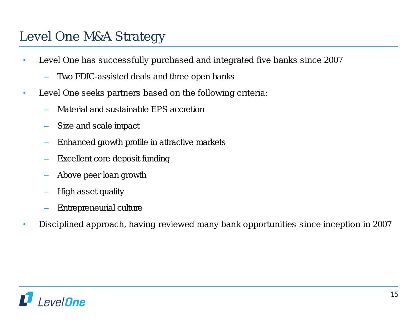 Level One M&A Strategy • Level One has successfully purchased and integrated five banks since 2007 – Two FDIC-assisted deals and three open banks • Level One seeks partners based on the following criteria: – Material and sustainable EPS accretion – Size and scale impact – Enhanced growth profile in attractive markets – Excellent core deposit funding – Above peer loan growth – High asset quality – Entrepreneurial culture • Disciplined approach, having reviewed many bank opportunities since inception in 2007 15