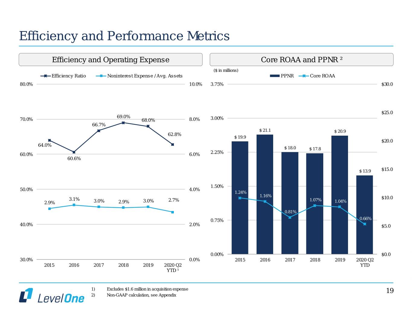 Interest Coverage and Pro Forma Double Leverage ($ in millions) As of the Period Ended, Pro Forma 2016Y 2017Y 2018Y 2019Y 2020 Q2 2020 Q2 Equity Investment in Subsidiaries $109.2 $120.8 $155.2 $178.2 $221.8 $226.8 Consolidated Equity $96.6 $108.0 $151.8 $170.7 $180.3 $205.3 Double Leverage Ratio 113.0% 111.9% 102.2% 104.4% 123.0% 110.5% ($ in millions) As For the Period Ended, 2016Y 2017Y 2018Y 2019Y 2020 Q2 YTD Total Deposit Interest $4.5 $6.3 $11.1 $16.9 $6.7 Other Borrowed Interest 1.3 1.8 2.3 2.5 2.4 Total Interest Expense $5.8 $8.1 $13.4 $19.4 $9.2 Pre-Tax Income $17.1 $16.6 $17.4 $19.5 $7.8 Interest Coverage (including deposit expense) 3.95x 3.05x 2.30x 2.01x 1.85x Interest Coverage (excluding deposit expense) 14.15x 10.22x 8.57x 8.80x 4.25x Note: Assumes $25 million preferred stock issuance, 20% downstreamed to Level One Bank; Illustrative ratios exclude issuance fees 38
