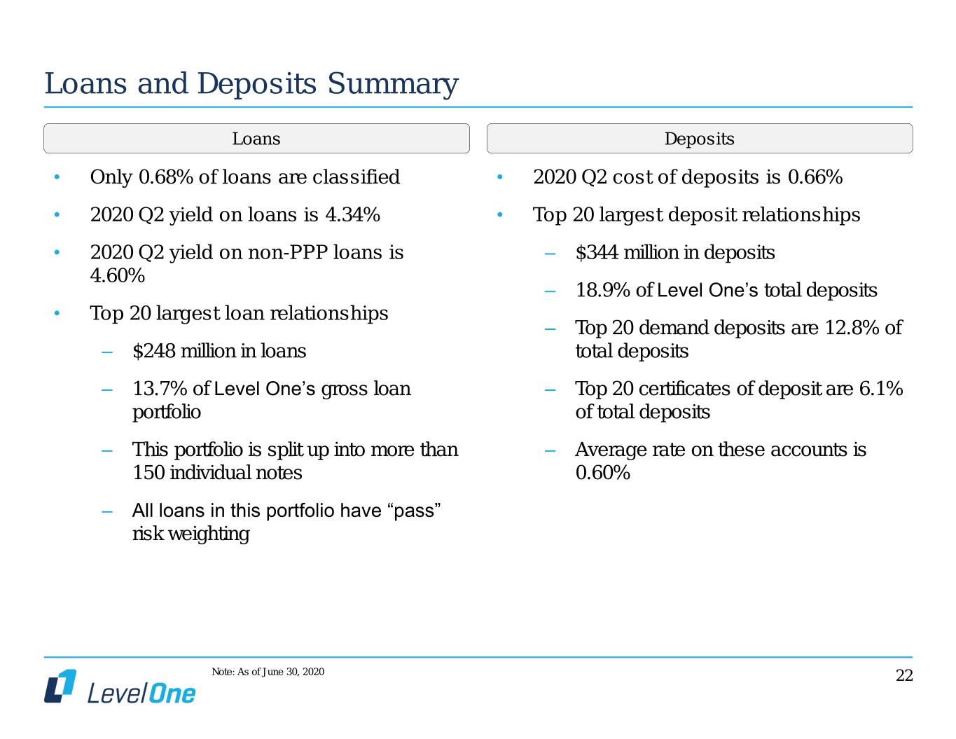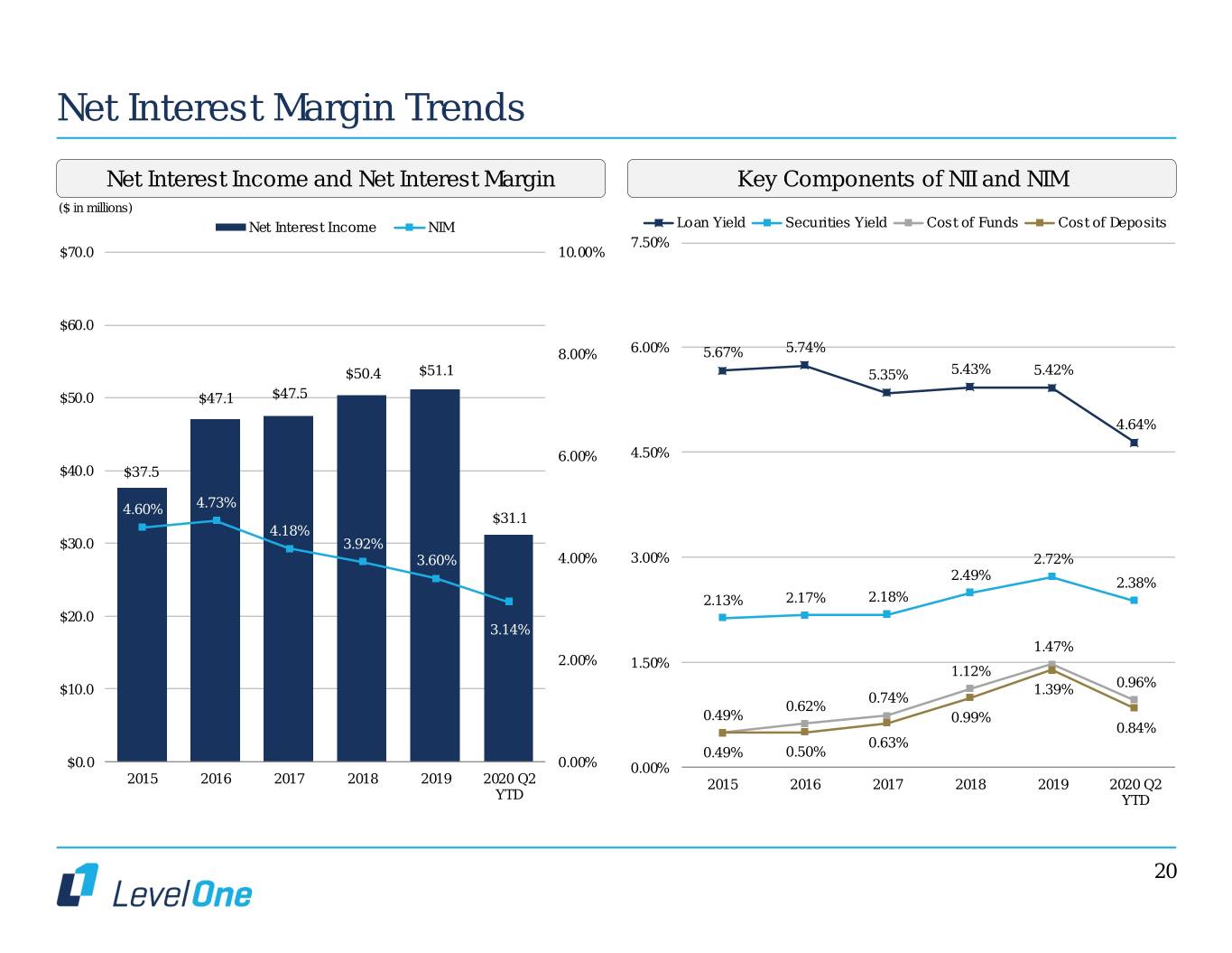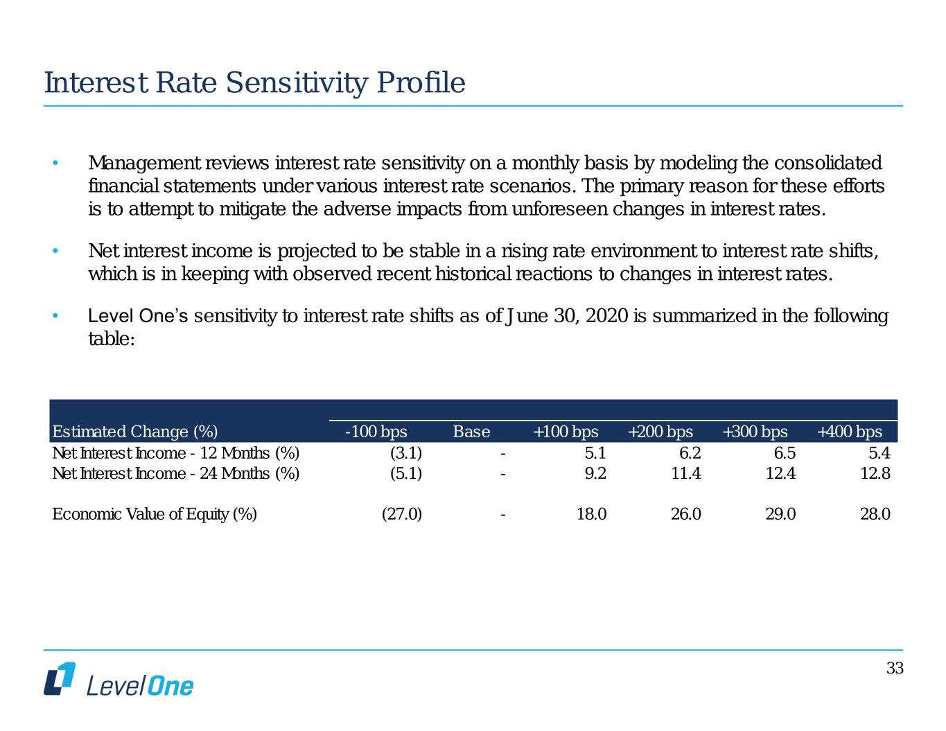 Interest Rate Sensitivity Profile • Management reviews interest rate sensitivity on a monthly basis by modeling the consolidated financial statements under various interest rate scenarios. The primary reason for these efforts is to attempt to mitigate the adverse impacts from unforeseen changes in interest rates. • Net interest income is projected to be stable in a rising rate environment to interest rate shifts, which is in keeping with observed recent historical reactions to changes in interest rates. • Level One’s sensitivity to interest rate shifts as of June 30, 2020 is summarized in the following table: Estimated Change (%) -100 bps Base +100 bps +200 bps +300 bps +400 bps Net Interest Income - 12 Months (%) (3.1) - 5.1 6.2 6.5 5.4 Net Interest Income - 24 Months (%) (5.1) - 9.2 11.4 12.4 12.8 Economic Value of Equity (%) (27.0) - 18.0 26.0 29.0 28.0 33