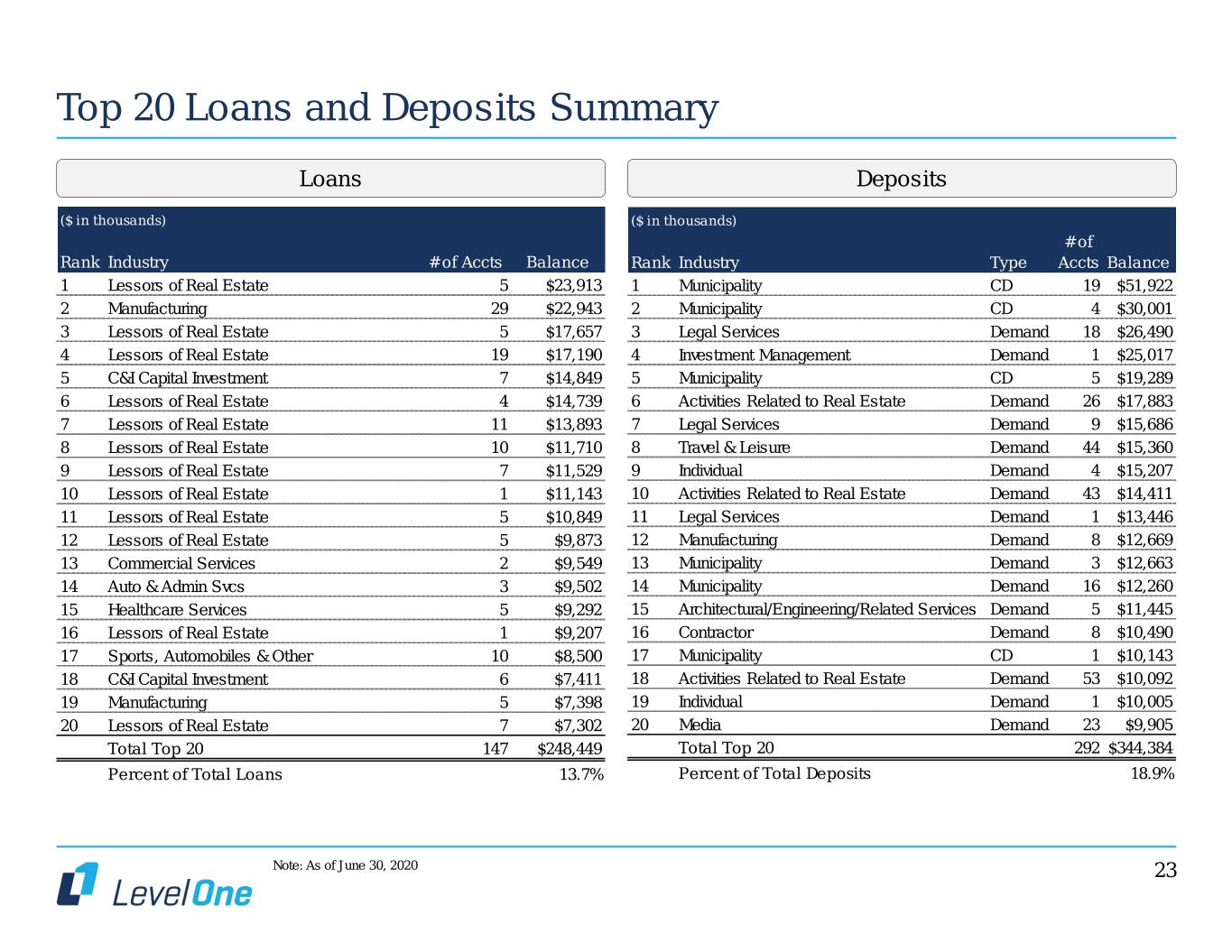 Loans and Deposits Summary Loans Deposits • Only 0.68% of loans are classified • 2020 Q2 cost of deposits is 0.66% • 2020 Q2 yield on loans is 4.34% • Top 20 largest deposit relationships • 2020 Q2 yield on non-PPP loans is – $344 million in deposits 4.60% – 18.9% of Level One’s total deposits • Top 20 largest loan relationships – Top 20 demand deposits are 12.8% of – $248 million in loans total deposits – 13.7% of Level One’s gross loan – Top 20 certificates of deposit are 6.1% portfolio of total deposits – This portfolio is split up into more than – Average rate on these accounts is 150 individual notes 0.60% – All loans in this portfolio have “pass” risk weighting Note: As of June 30, 2020 22