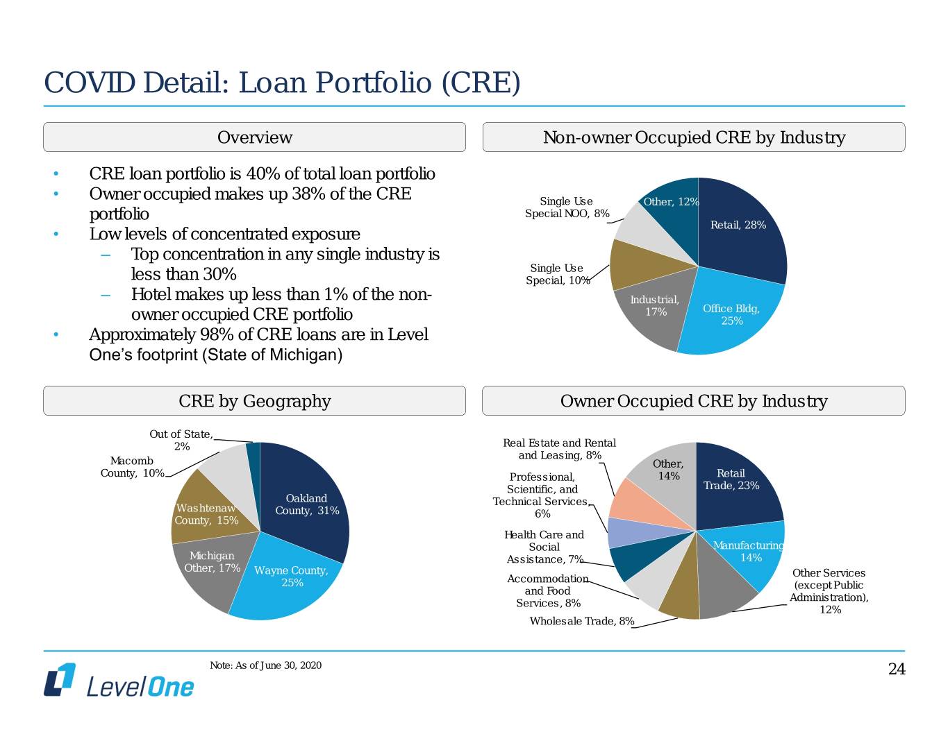 COVID Detail: Loan Portfolio (CRE) Overview Non-owner Occupied CRE by Industry • CRE loan portfolio is 40% of total loan portfolio • Owner occupied makes up 38% of the CRE Single Use Other, 12% portfolio Special NOO, 8% Retail, 28% • Low levels of concentrated exposure – Top concentration in any single industry is Single Use less than 30% Special, 10% – Hotel makes up less than 1% of the non- Industrial, 17% Office Bldg, owner occupied CRE portfolio 25% • Approximately 98% of CRE loans are in Level One’s footprint (State of Michigan) CRE by Geography Owner Occupied CRE by Industry Out of State, 2% Real Estate and Rental and Leasing, 8% Macomb Other, County, 10% Professional, 14% Retail Scientific, and Trade, 23% Oakland Technical Services, Washtenaw County, 31% 6% County, 15% Health Care and Social Manufacturing, Michigan Assistance, 7% 14% Other, 17% Wayne County, Other Services Accommodation 25% (except Public and Food Administration), Services, 8% 12% Wholesale Trade, 8% Note: As of June 30, 2020 24