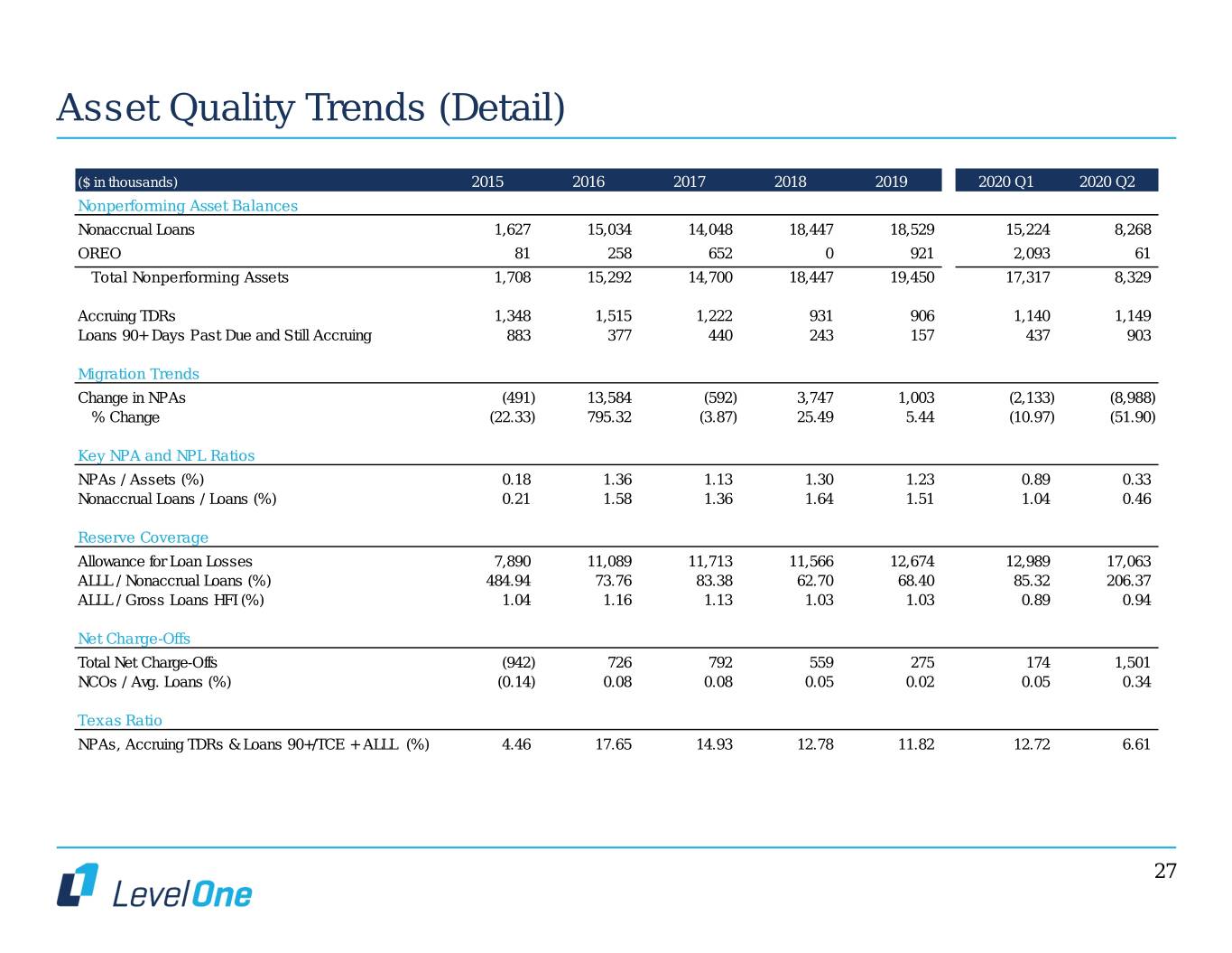 Asset Quality Trends (Detail) ($ in thousands) 2015 2016 2017 2018 2019 2020 Q1 2020 Q2 Nonperforming Asset Balances Nonaccrual Loans 1,627 15,034 14,048 18,447 18,529 15,224 8,268 OREO 81 258 652 0 921 2,093 61 Total Nonperforming Assets 1,708 15,292 14,700 18,447 19,450 17,317 8,329 Accruing TDRs 1,348 1,515 1,222 931 906 1,140 1,149 Loans 90+ Days Past Due and Still Accruing 883 377 440 243 157 437 903 Migration Trends Change in NPAs (491) 13,584 (592) 3,747 1,003 (2,133) (8,988) % Change (22.33) 795.32 (3.87) 25.49 5.44 (10.97) (51.90) Key NPA and NPL Ratios NPAs / Assets (%) 0.18 1.36 1.13 1.30 1.23 0.89 0.33 Nonaccrual Loans / Loans (%) 0.21 1.58 1.36 1.64 1.51 1.04 0.46 Reserve Coverage Allowance for Loan Losses 7,890 11,089 11,713 11,566 12,674 12,989 17,063 ALLL / Nonaccrual Loans (%) 484.94 73.76 83.38 62.70 68.40 85.32 206.37 ALLL / Gross Loans HFI (%) 1.04 1.16 1.13 1.03 1.03 0.89 0.94 Net Charge-Offs Total Net Charge-Offs (942) 726 792 559 275 174 1,501 NCOs / Avg. Loans (%) (0.14) 0.08 0.08 0.05 0.02 0.05 0.34 Texas Ratio NPAs, Accruing TDRs & Loans 90+/TCE + ALLL (%) 4.46 17.65 14.93 12.78 11.82 12.72 6.61 27