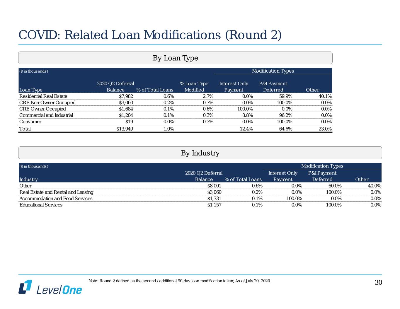 COVID: Related Loan Modifications (Round 2) By Loan Type ($ in thousands) Modification Types 2020 Q2 Deferral % Loan Type Interest Only P&I Payment Loan Type Balance % of Total Loans Modified Payment Deferred Other Residential Real Estate $7,982 0.6% 2.7% 0.0% 59.9% 40.1% CRE Non-Owner Occupied $3,060 0.2% 0.7% 0.0% 100.0% 0.0% CRE Owner Occupied $1,684 0.1% 0.6% 100.0% 0.0% 0.0% Commercial and Industrial $1,204 0.1% 0.3% 3.8% 96.2% 0.0% Consumer $19 0.0% 0.3% 0.0% 100.0% 0.0% Total $13,949 1.0% 12.4% 64.6% 23.0% By Industry ($ in thousands) Modification Types 2020 Q2 Deferral Interest Only P&I Payment Industry Balance % of Total Loans Payment Deferred Other Other $8,001 0.6% 0.0% 60.0% 40.0% Real Estate and Rental and Leasing $3,060 0.2% 0.0% 100.0% 0.0% Accommodation and Food Services $1,731 0.1% 100.0% 0.0% 0.0% Educational Services $1,157 0.1% 0.0% 100.0% 0.0% Note: Round 2 defined as the second / additional 90-day loan modification taken; As of July 20, 2020 30