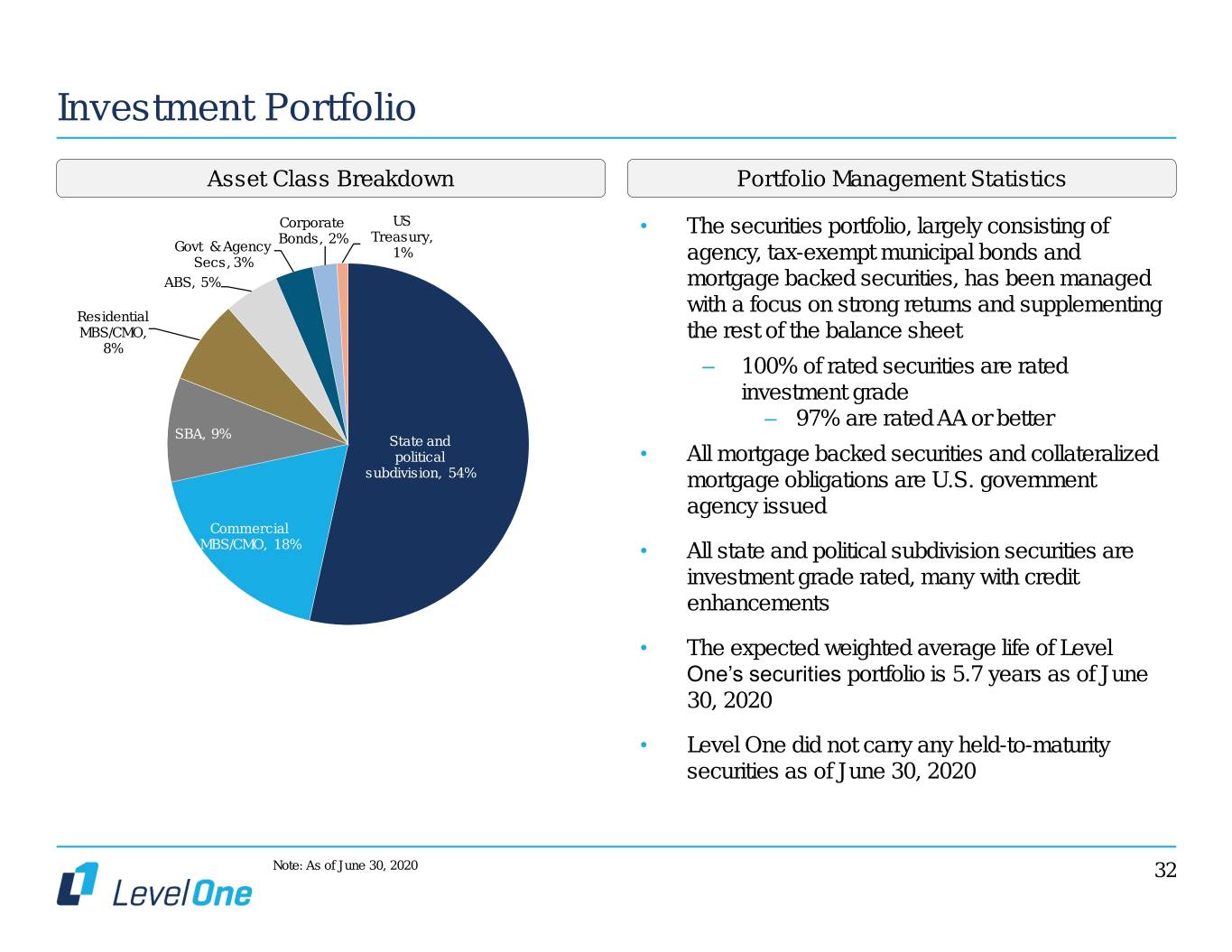Investment Portfolio Asset Class Breakdown Portfolio Management Statistics Corporate US • The securities portfolio, largely consisting of Bonds, 2% Treasury, Govt & Agency 1% Secs, 3% agency, tax-exempt municipal bonds and ABS, 5% mortgage backed securities, has been managed with a focus on strong returns and supplementing Residential MBS/CMO, the rest of the balance sheet 8% – 100% of rated securities are rated investment grade – 97% are rated AA or better SBA, 9% State and political • All mortgage backed securities and collateralized subdivision, 54% mortgage obligations are U.S. government agency issued Commercial MBS/CMO, 18% • All state and political subdivision securities are investment grade rated, many with credit enhancements • The expected weighted average life of Level One’s securities portfolio is 5.7 years as of June 30, 2020 • Level One did not carry any held-to-maturity securities as of June 30, 2020 Note: As of June 30, 2020 32