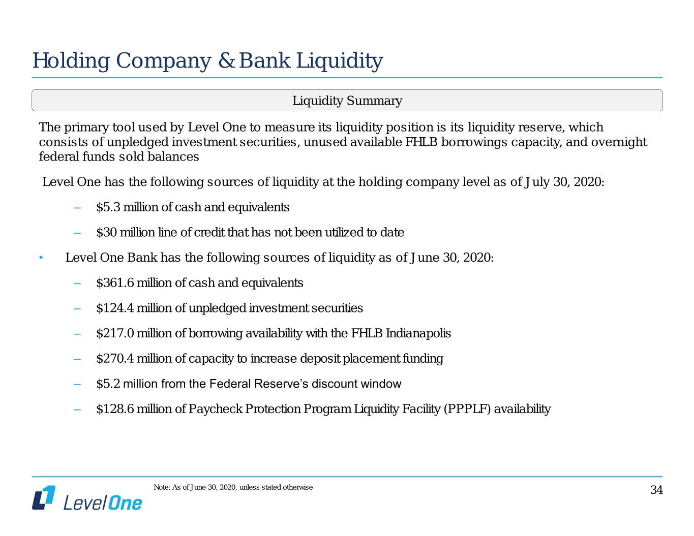 Holding Company & Bank Liquidity Liquidity Summary The primary tool used by Level One to measure its liquidity position is its liquidity reserve, which consists of unpledged investment securities, unused available FHLB borrowings capacity, and overnight federal funds sold balances Level One has the following sources of liquidity at the holding company level as of July 30, 2020: – $5.3 million of cash and equivalents – $30 million line of credit that has not been utilized to date • Level One Bank has the following sources of liquidity as of June 30, 2020: – $361.6 million of cash and equivalents – $124.4 million of unpledged investment securities – $217.0 million of borrowing availability with the FHLB Indianapolis – $270.4 million of capacity to increase deposit placement funding – $5.2 million from the Federal Reserve’s discount window – $128.6 million of Paycheck Protection Program Liquidity Facility (PPPLF) availability Note: As of June 30, 2020, unless stated otherwise 34