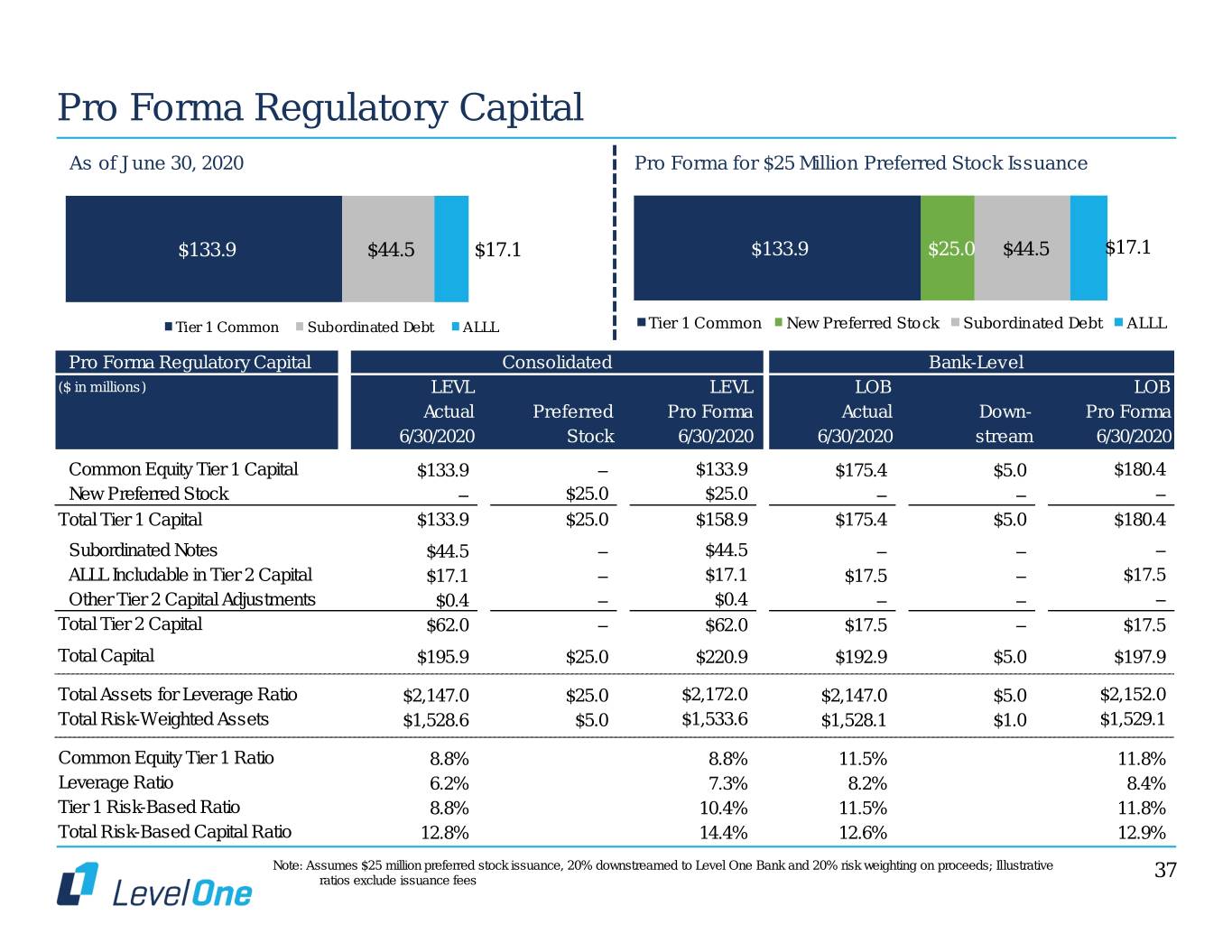 Pro Forma Regulatory Capital As of June 30, 2020 Pro Forma for $25 Million Preferred Stock Issuance $133.9 $44.5 $17.1 $133.9 $25.0 $44.5 $17.1 Tier 1 Common Subordinated Debt ALLL Tier 1 Common New Preferred Stock Subordinated Debt ALLL Pro Forma Regulatory Capital Consolidated Bank-Level ($ in millions) LEVL LEVL LOB LOB Actual Preferred Pro Forma Actual Down- Pro Forma 6/30/2020 Stock 6/30/2020 6/30/2020 stream 6/30/2020 Common Equity Tier 1 Capital $133.9 – $133.9 $175.4 $5.0 $180.4 New Preferred Stock – $25.0 $25.0 – – – Total Tier 1 Capital $133.9 $25.0 $158.9 $175.4 $5.0 $180.4 Subordinated Notes $44.5 – $44.5 – – – ALLL Includable in Tier 2 Capital $17.1 – $17.1 $17.5 – $17.5 Other Tier 2 Capital Adjustments $0.4 – $0.4 – – – Total Tier 2 Capital $62.0 – $62.0 $17.5 – $17.5 Total Capital $195.9 $25.0 $220.9 $192.9 $5.0 $197.9 Total Assets for Leverage Ratio $2,147.0 $25.0 $2,172.0 $2,147.0 $5.0 $2,152.0 Total Risk-Weighted Assets $1,528.6 $5.0 $1,533.6 $1,528.1 $1.0 $1,529.1 Common Equity Tier 1 Ratio 8.8% 8.8% 11.5% 11.8% Leverage Ratio 6.2% 7.3% 8.2% 8.4% Tier 1 Risk-Based Ratio 8.8% 10.4% 11.5% 11.8% Total Risk-Based Capital Ratio 12.8% 14.4% 12.6% 12.9% Note: Assumes $25 million preferred stock issuance, 20% downstreamed to Level One Bank and 20% risk weighting on proceeds; Illustrative ratios exclude issuance fees 37