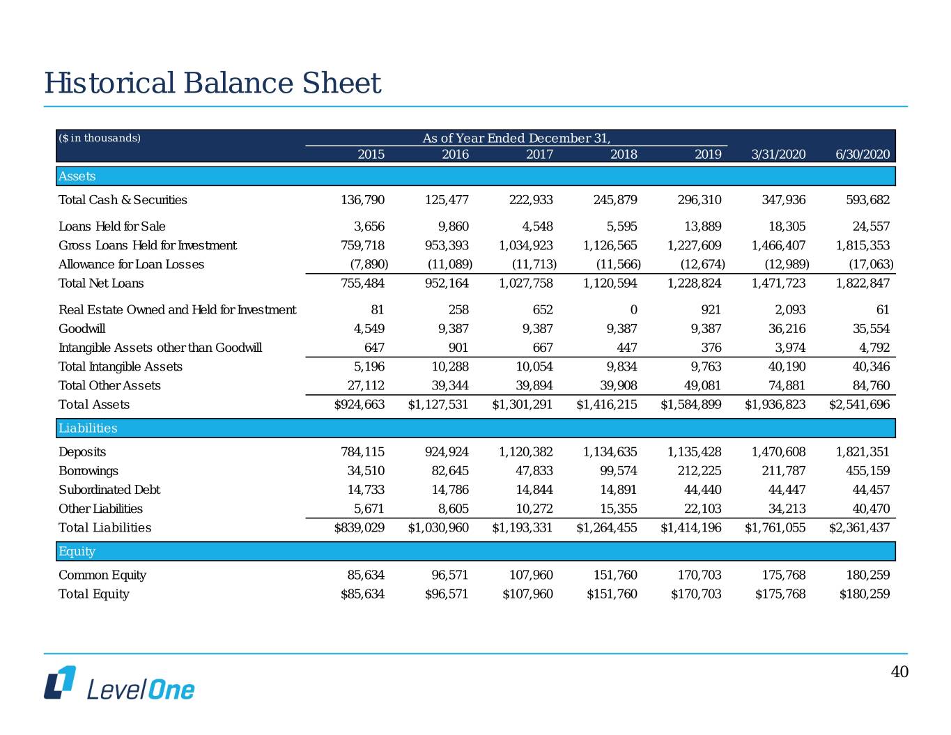 Historical Balance Sheet ($ in thousands) As of Year Ended December 31, 2015 2016 2017 2018 2019 3/31/2020 6/30/2020 Assets Total Cash & Securities 136,790 125,477 222,933 245,879 296,310 347,936 593,682 Loans Held for Sale 3,656 9,860 4,548 5,595 13,889 18,305 24,557 Gross Loans Held for Investment 759,718 953,393 1,034,923 1,126,565 1,227,609 1,466,407 1,815,353 Allowance for Loan Losses (7,890) (11,089) (11,713) (11,566) (12,674) (12,989) (17,063) Total Net Loans 755,484 952,164 1,027,758 1,120,594 1,228,824 1,471,723 1,822,847 Real Estate Owned and Held for Investment 81 258 652 0 921 2,093 61 Goodwill 4,549 9,387 9,387 9,387 9,387 36,216 35,554 Intangible Assets other than Goodwill 647 901 667 447 376 3,974 4,792 Total Intangible Assets 5,196 10,288 10,054 9,834 9,763 40,190 40,346 Total Other Assets 27,112 39,344 39,894 39,908 49,081 74,881 84,760 Total Assets $924,663 $1,127,531 $1,301,291 $1,416,215 $1,584,899 $1,936,823 $2,541,696 Liabilities Deposits 784,115 924,924 1,120,382 1,134,635 1,135,428 1,470,608 1,821,351 Borrowings 34,510 82,645 47,833 99,574 212,225 211,787 455,159 Subordinated Debt 14,733 14,786 14,844 14,891 44,440 44,447 44,457 Other Liabilities 5,671 8,605 10,272 15,355 22,103 34,213 40,470 Total Liabilities $839,029 $1,030,960 $1,193,331 $1,264,455 $1,414,196 $1,761,055 $2,361,437 Equity Common Equity 85,634 96,571 107,960 151,760 170,703 175,768 180,259 Total Equity $85,634 $96,571 $107,960 $151,760 $170,703 $175,768 $180,259 40
