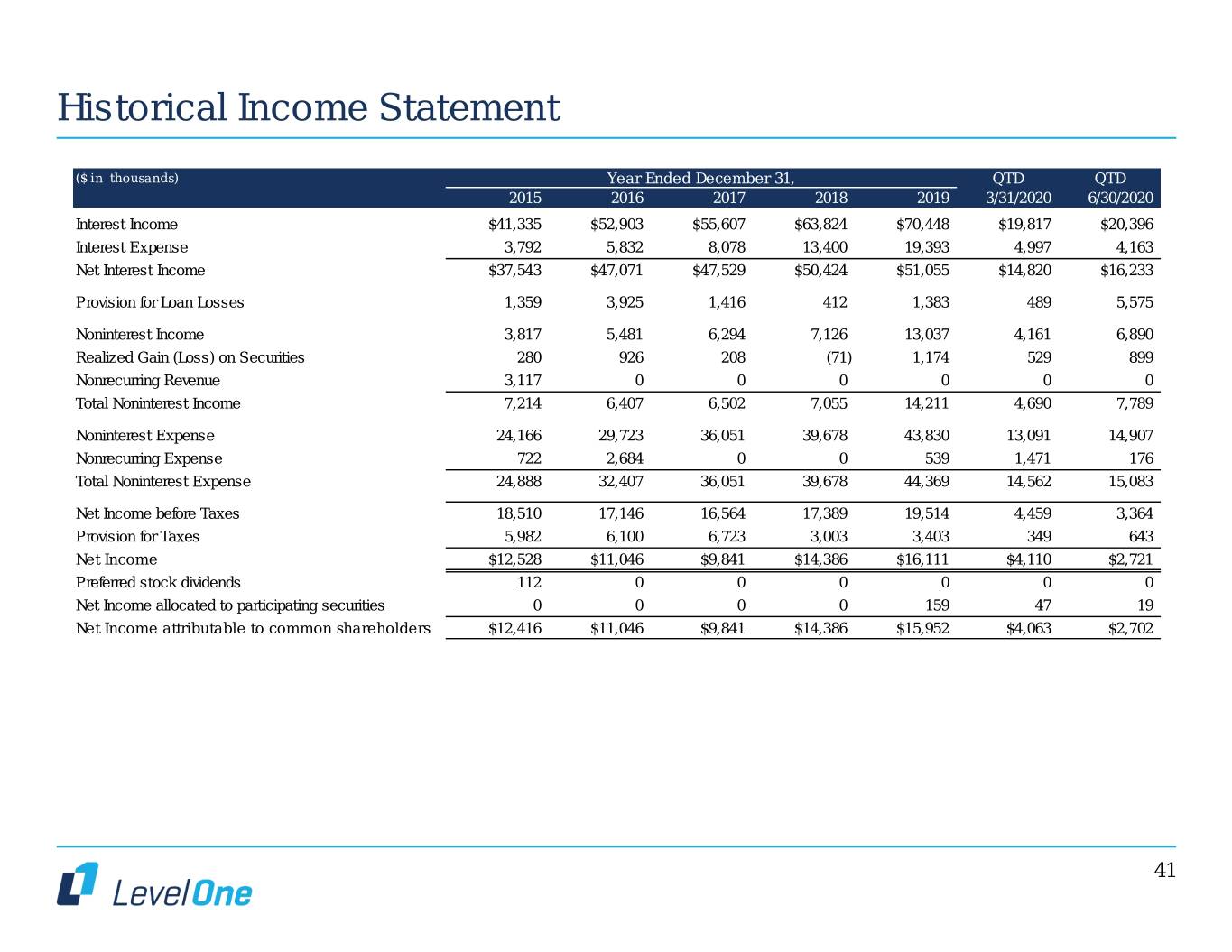 Historical Income Statement ($ in thousands) Year Ended December 31, QTD QTD 2015 2016 2017 2018 2019 3/31/2020 6/30/2020 Interest Income $41,335 $52,903 $55,607 $63,824 $70,448 $19,817 $20,396 Interest Expense 3,792 5,832 8,078 13,400 19,393 4,997 4,163 Net Interest Income $37,543 $47,071 $47,529 $50,424 $51,055 $14,820 $16,233 Provision for Loan Losses 1,359 3,925 1,416 412 1,383 489 5,575 Noninterest Income 3,817 5,481 6,294 7,126 13,037 4,161 6,890 Realized Gain (Loss) on Securities 280 926 208 (71) 1,174 529 899 Nonrecurring Revenue 3,117 0 0 0 0 0 0 Total Noninterest Income 7,214 6,407 6,502 7,055 14,211 4,690 7,789 Noninterest Expense 24,166 29,723 36,051 39,678 43,830 13,091 14,907 Nonrecurring Expense 722 2,684 0 0 539 1,471 176 Total Noninterest Expense 24,888 32,407 36,051 39,678 44,369 14,562 15,083 Net Income before Taxes 18,510 17,146 16,564 17,389 19,514 4,459 3,364 Provision for Taxes 5,982 6,100 6,723 3,003 3,403 349 643 Net Income $12,528 $11,046 $9,841 $14,386 $16,111 $4,110 $2,721 Preferred stock dividends 112 0 0 0 0 0 0 Net Income allocated to participating securities 0 0 0 0 159 47 19 Net Income attributable to common shareholders $12,416 $11,046 $9,841 $14,386 $15,952 $4,063 $2,702 41
