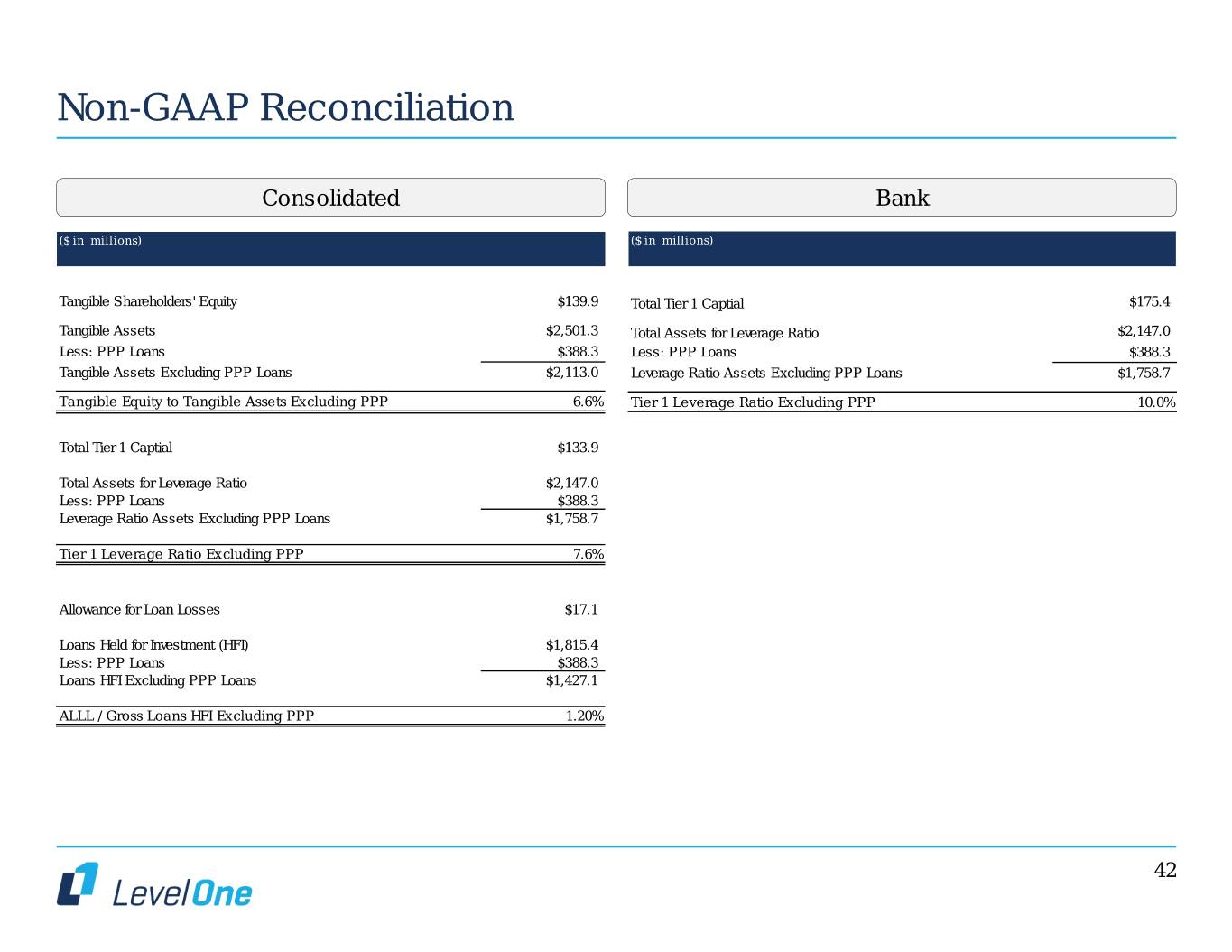 Non-GAAP Reconciliation Consolidated Bank ($ in millions) ($ in millions) Tangible Shareholders' Equity $139.9 Total Tier 1 Captial $175.4 Tangible Assets $2,501.3 Total Assets for Leverage Ratio $2,147.0 Less: PPP Loans $388.3 Less: PPP Loans $388.3 Tangible Assets Excluding PPP Loans $2,113.0 Leverage Ratio Assets Excluding PPP Loans $1,758.7 Tangible Equity to Tangible Assets Excluding PPP 6.6% Tier 1 Leverage Ratio Excluding PPP 10.0% Total Tier 1 Captial $133.9 Total Assets for Leverage Ratio $2,147.0 Less: PPP Loans $388.3 Leverage Ratio Assets Excluding PPP Loans $1,758.7 Tier 1 Leverage Ratio Excluding PPP 7.6% Allowance for Loan Losses $17.1 Loans Held for Investment (HFI) $1,815.4 Less: PPP Loans $388.3 Loans HFI Excluding PPP Loans $1,427.1 ALLL / Gross Loans HFI Excluding PPP 1.20% 42