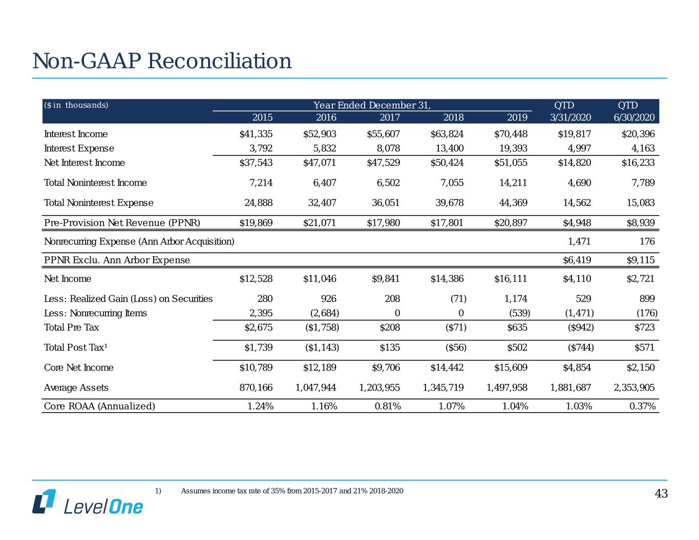 Non-GAAP Reconciliation ($ in thousands) Year Ended December 31, QTD QTD 2015 2016 2017 2018 2019 3/31/2020 6/30/2020 Interest Income $41,335 $52,903 $55,607 $63,824 $70,448 $19,817 $20,396 Interest Expense 3,792 5,832 8,078 13,400 19,393 4,997 4,163 Net Interest Income $37,543 $47,071 $47,529 $50,424 $51,055 $14,820 $16,233 Total Noninterest Income 7,214 6,407 6,502 7,055 14,211 4,690 7,789 Total Noninterest Expense 24,888 32,407 36,051 39,678 44,369 14,562 15,083 Pre-Provision Net Revenue (PPNR) $19,869 $21,071 $17,980 $17,801 $20,897 $4,948 $8,939 Nonrecurring Expense (Ann Arbor Acquisition) 1,471 176 PPNR Exclu. Ann Arbor Expense $6,419 $9,115 Net Income $12,528 $11,046 $9,841 $14,386 $16,111 $4,110 $2,721 Less: Realized Gain (Loss) on Securities 280 926 208 (71) 1,174 529 899 Less: Nonrecurring Items 2,395 (2,684) 0 0 (539) (1,471) (176) Total Pre Tax $2,675 ($1,758) $208 ($71) $635 ($942) $723 Total Post Tax¹ $1,739 ($1,143) $135 ($56) $502 ($744) $571 Core Net Income $10,789 $12,189 $9,706 $14,442 $15,609 $4,854 $2,150 Average Assets 870,166 1,047,944 1,203,955 1,345,719 1,497,958 1,881,687 2,353,905 Core ROAA (Annualized) 1.24% 1.16% 0.81% 1.07% 1.04% 1.03% 0.37% 1) Assumes income tax rate of 35% from 2015-2017 and 21% 2018-2020 43