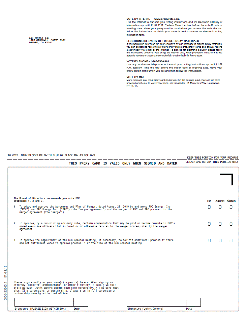 VOTE BY INTERNET - www.proxyvote.com Use the Internet to transmit your voting instructions and for electronic delivery of information up until 11:59 P.M. Eastern Time the day before the cut-off date or meeting date. Have your proxy card in hand when you access the web site and follow the instructions to obtain your records and to create an electronic voting instruction form. SRC ENERGY INC. 1675 BROADWAY, SUITE 2600 DENVER, CO 80202 ELECTRONIC DELIVERY OF FUTURE PROXY MATERIALS If you would like to reduce the costs incurred by our company in mailing proxy materials, you can consent to receiving all future proxy statements, proxy cards and annual reports electronically via e-mail or the Internet. To sign up for electronic delivery, please follow the instructions above to vote using the Internet and, when prompted, indicate that you agree to receive or access proxy materials electronically in future years. VOTE BY PHONE - 1-800-690-6903 Use any touch-tone telephone to transmit your voting instructions up until 11:59 P.M. Eastern Time the day before the cut-off date or meeting date. Have your proxy card in hand when you call and then follow the instructions. VOTE BY MAIL Mark, sign and date your proxy card and return it in the postage-paid envelope we have provided or return it to Vote Processing, c/o Broadridge, 51 Mercedes Way, Edgewood, NY 11717. TO VOTE, MARK BLOCKS BELOW IN BLUE OR BLACK INK AS FOLLOWS: KEEP THIS PORTION FOR YOUR RECORDS DETACH AND RETURN THIS PORTION ONLY THIS PROXY CARD IS VALID ONLY WHEN SIGNED AND DATED. The Board of Directors recommends you vote FOR proposals 1, 2 and 3. For 0 Against 0 Abstain 0 1 To adopt and approve the Agreement and Plan of Merger, dated August 25, 2019 by and among PDC Energy, Inc. ("PDC") and SRC Energy Inc. ("SRC") (the "merger agreement") and the merger of PDC and SRC pursuant to the merger agreement (the "merger"). 0 0 0 2 To approve, by a non-binding advisory vote, certain compensation that may be paid or become payable to SRC's named executive officers that is based on or otherwise relates to the merger contemplated by the merger agreement. 0 0 0 3 To approve the adjournment of the SRC special meeting, if necessary, to solicit additional proxies if there are not sufficient votes to approve proposal 1 at the time of the SRC special meeting. Please sign exactly as your name(s) appear(s) hereon. When signing as attorney, executor, administrator, or other fiduciary, please give full title as such. Joint owners should each sign personally. All holders must sign. If a corporation or partnership, please sign in full corporate or partnership name by authorized officer. Signature [PLEASE SIGN WITHIN BOX] Date Signature (Joint Owners) Date 0000433346_1 R1.0.1.18