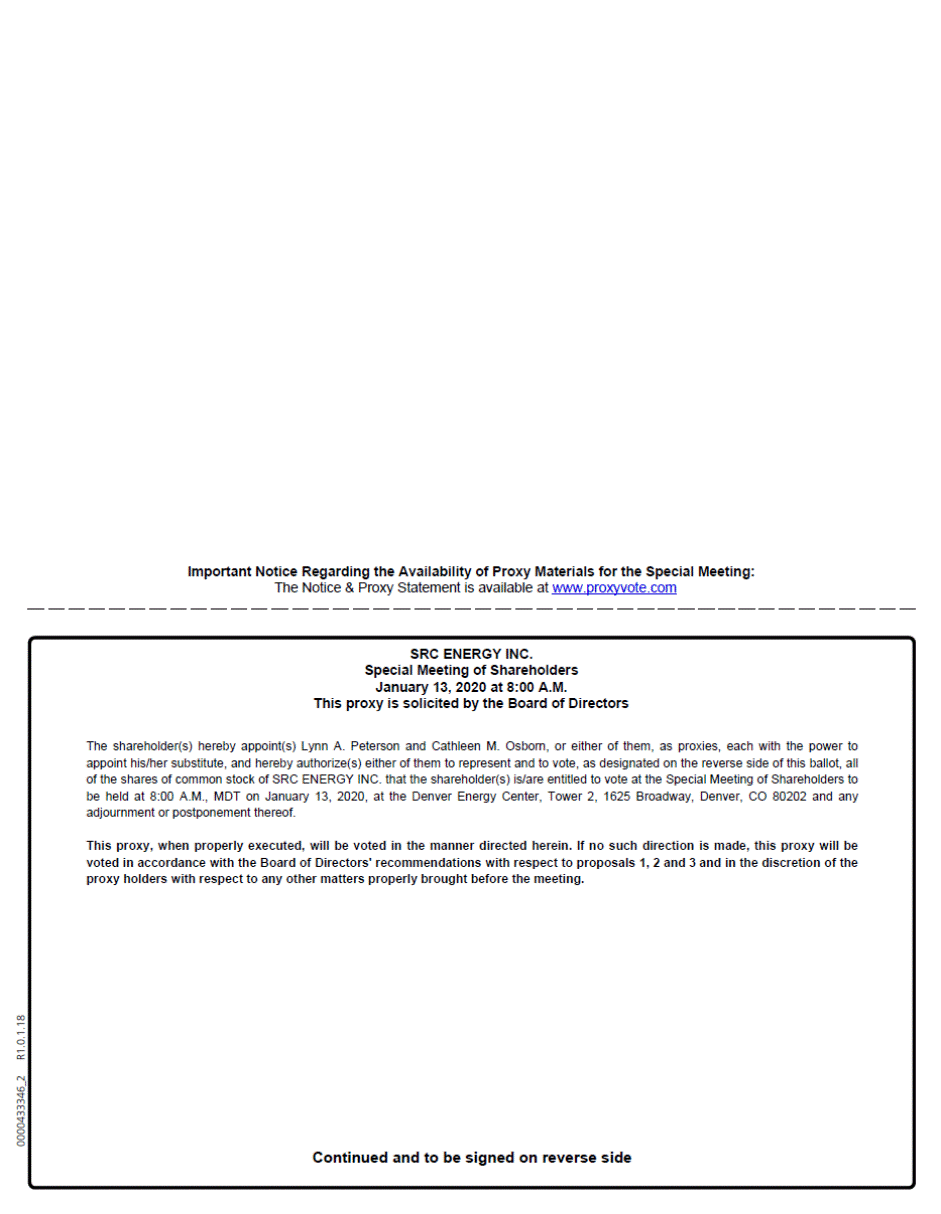 Important Notice Regarding the Availability of Proxy Materials for the Special Meeting: The Notice & Proxy Statement is available at www.proxyvote.com SRC ENERGY INC. Special Meeting of Shareholders January 13, 2020 at 8:00 A.M. This proxy is solicited by the Board of Directors The shareholder(s) hereby appoint(s) Lynn A. Peterson and Cathleen M. Osborn, or either of them, as proxies, each with the power to appoint his/her substitute, and hereby authorize(s) either of them to represent and to vote, as designated on the reverse side of this ballot, all of the shares of common stock of SRC ENERGY INC. that the shareholder(s) is/are entitled to vote at the Special Meeting of Shareholders to be held at 8:00 A.M., MDT on January 13, 2020, at the Denver Energy Center, Tower 2, 1625 Broadway, Denver, CO 80202 and any adjournment or postponement thereof. This proxy, when properly executed, will be voted in the manner directed herein. If no such direction is made, this proxy will be voted in accordance with the Board of Directors' recommendations with respect to proposals 1, 2 and 3 and in the discretion of the proxy holders with respect to any other matters properly brought before the meeting. Continued and to be signed on reverse side 0000433346_2 R1.0.1.18