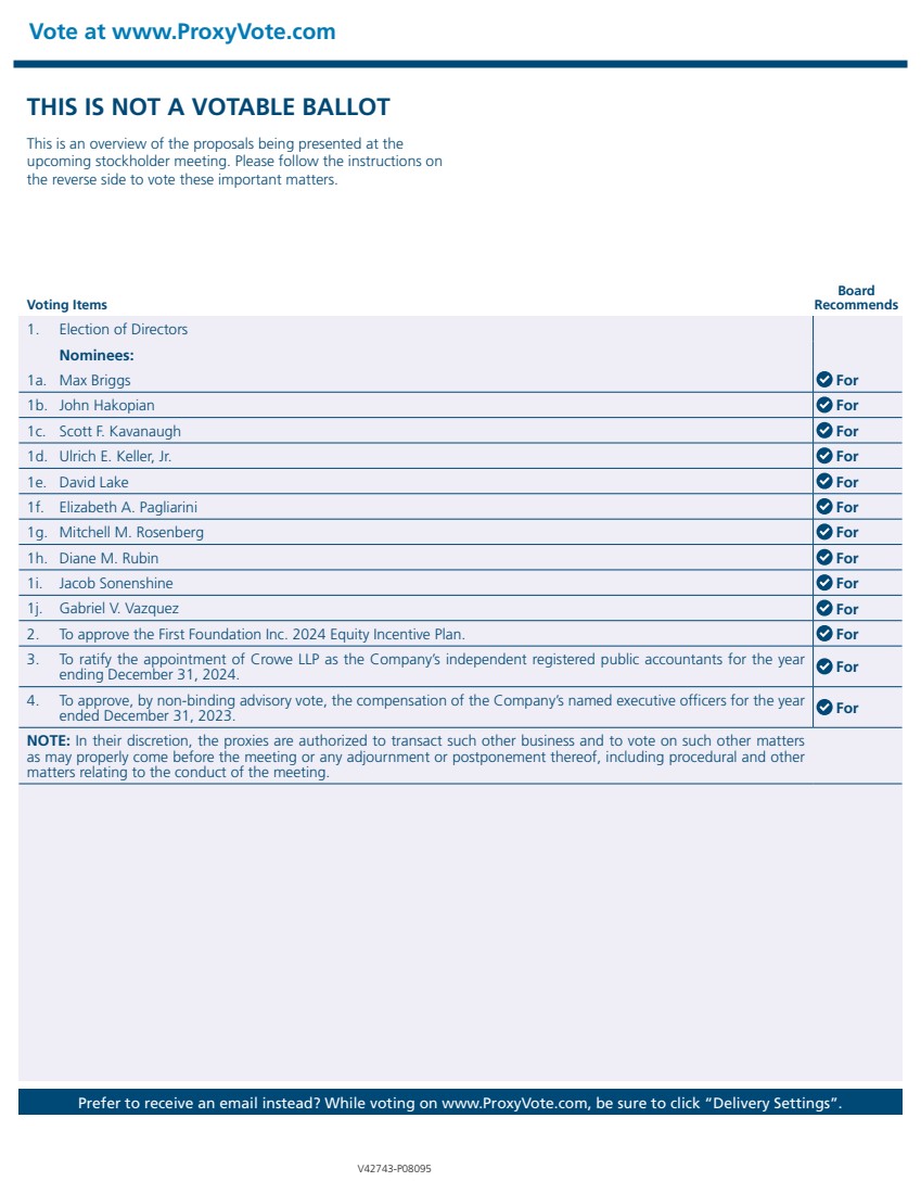 | THIS IS NOT A VOTABLE BALLOT This is an overview of the proposals being presented at the upcoming stockholder meeting. Please follow the instructions on the reverse side to vote these important matters. Vote at www.ProxyVote.com Prefer to receive an email instead? While voting on www.ProxyVote.com, be sure to click “Delivery Settings”. V42743-P08095 Voting Items Board Recommends 1. Election of Directors Nominees: 1a. Max Briggs For 1b. John Hakopian For 1c. Scott F. Kavanaugh For 1d. Ulrich E. Keller, Jr. For 1e. David Lake For 1f. Elizabeth A. Pagliarini For 1g. Mitchell M. Rosenberg For 1h. Diane M. Rubin For 1i. Jacob Sonenshine For 1j. Gabriel V. Vazquez For 2. To approve the First Foundation Inc. 2024 Equity Incentive Plan. For 3. To ratify the appointment of Crowe LLP as the Company’s independent registered public accountants for the year ending December 31, 2024. For 4. To approve, by non-binding advisory vote, the compensation of the Company’s named executive officers for the year ended December 31, 2023. For NOTE: In their discretion, the proxies are authorized to transact such other business and to vote on such other matters as may properly come before the meeting or any adjournment or postponement thereof, including procedural and other matters relating to the conduct of the meeting. |