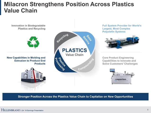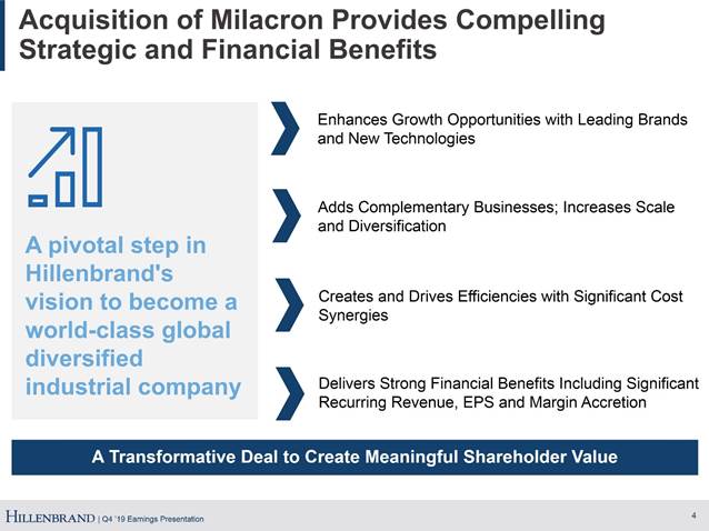 Cautionary Statements 3 Additional Information and Where to Find It In connection with the proposed acquisition by Hillenbrand of Milacron (the “Proposed Transaction”), Hillenbrand has filed with the SEC a registration statement on Form S-4 to register the shares of Hillenbrand’s common stock to be issued in connection with the Proposed Transaction. The registration statement includes a document that serves as a prospectus of Hillenbrand and a proxy statement of Milacron (the “proxy statement/prospectus”), and each party will file other documents regarding the Proposed Transaction with the SEC. The registration statement became effective on October 18, 2019. INVESTORS AND SECURITY HOLDERS ARE URGED TO READ THE REGISTRATION STATEMENT, PROXY STATEMENT/PROSPECTUS, INCLUDING ANY AMENDMENTS OR SUPPLEMENTS TO THOSE DOCUMENTS, AND ANY OTHER RELEVANT DOCUMENTS FILED OR TO BE FILED WITH THE SEC IN CONNECTION WITH THE PROPOSED TRANSACTION, BECAUSE THEY DO AND THEY WILL CONTAIN IMPORTANT INFORMATION ABOUT THE PROPOSED TRANSACTION AND THE PARTIES TO THE PROPOSED TRANSACTION. A definitive proxy statement/prospectus has been sent to Milacron’s stockholders. Investors and security holders may obtain the registration statement and the proxy statement/prospectus free of charge from the SEC’s website or from Hillenbrand or Milacron. The documents filed by Hillenbrand with the SEC may be obtained free of charge at Hillenbrand’s website at www.hillenbrand.com or at the SEC’s website at www.sec.gov. These documents may also be obtained free of charge from Hillenbrand by requesting them by mail at Hillenbrand, Inc., One Batesville Boulevard, Batesville, IN 47006, or by telephone at (812) 931-6000. The documents filed by Milacron with the SEC may be obtained free of charge at Milacron’s website at www.milacron.com or at the SEC’s website at www.sec.gov. These documents may also be obtained free of charge from Milacron by requesting them by mail at Milacron Holdings Corp., 10200 Alliance Road, Suite 200, Cincinnati, OH, 45242, or by telephone at (513) 487-5000. Participants in the Solicitation Hillenbrand, Milacron and their respective directors and executive officers and other members of management and employees may be deemed to be participants in the solicitation of proxies from Milacron’s stockholders with respect to the Proposed Transaction. Information about Hillenbrand’s directors and executive officers is available in Hillenbrand’s Annual Report on Form 10-K for the fiscal year ended September 30, 2019 filed with the SEC on November 13, 2019 and its definitive proxy statement for the 2019 annual meeting of shareholders filed with the SEC on January 2, 2019. Information concerning the ownership of Milacron’s securities by Milacron’s directors and executive officers is included in their SEC filings on Forms 3, 4 and 5, and additional information regarding the names, affiliations and interests of such individuals is available in Milacron’s Annual Report on Form 10-K for the fiscal year ended December 31, 2018 filed with the SEC on February 28, 2019 and its definitive proxy statement for the 2019 annual meeting of shareholders filed with the SEC on March 15, 2019. Other information regarding the participants in the proxy solicitation and a description of their direct and indirect interests, by security holdings or otherwise, are or will be contained in the registration statement, the proxy statement/prospectus and other relevant materials filed or to be filed with the SEC regarding the Proposed Transaction. Stockholders, potential investors and other readers should read the proxy statement/prospectus carefully before making any voting or investment decisions. You may obtain free copies of these documents from Hillenbrand or Milacron as indicated above. No Offer or Solicitation This presentation shall not constitute an offer to sell or the solicitation of an offer to buy any securities, nor shall there be any sale of securities in any jurisdiction in which such offer, solicitation or sale would be unlawful prior to registration or qualification under the securities laws of any such jurisdiction. No offering of securities shall be made except by means of a prospectus meeting the requirements of Section 10 of the U.S. Securities Act of 1933, as amended, or pursuant to another available exemption.