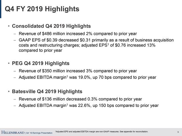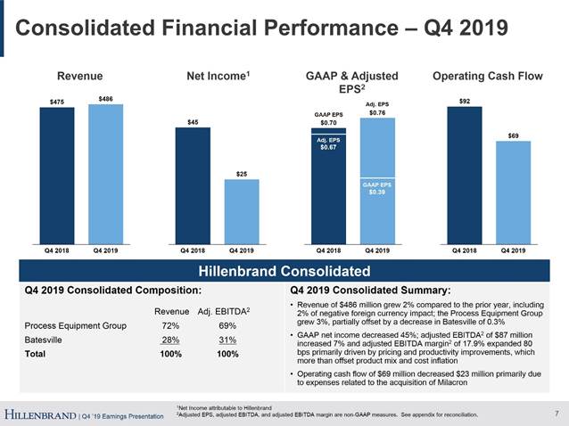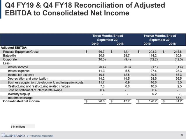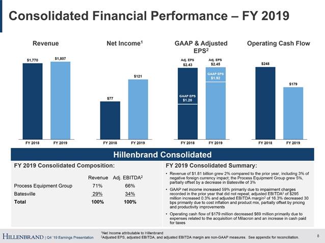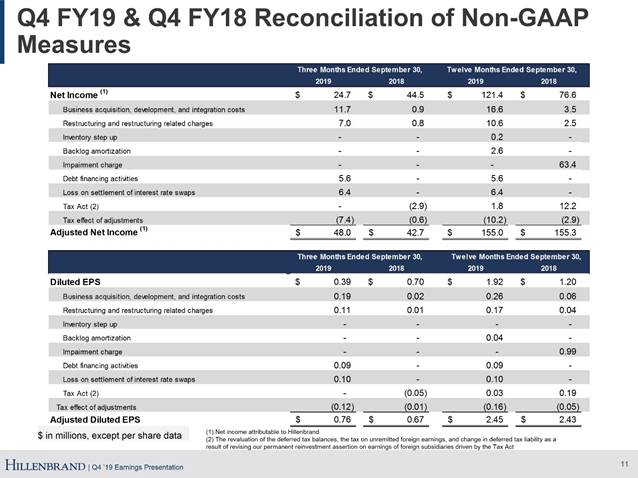The following is an excerpt of a presentation relating to Hillenbrand, Inc.’s results for the fourth quarter and fiscal year 2019, which ended September 30, 2019.