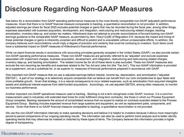 Disclosure Regarding Non-GAAP Measures See below for a reconciliation from GAAP operating performance measures to the most directly comparable non-GAAP (adjusted) performance measures. Given that there is no GAAP financial measure comparable to backlog, a quantitative reconciliation is not provided. In addition, adjusted earnings per share for fiscal 2020 excludes potential charges or gains that may be recorded during the fiscal year, among other things, expenses associated with business acquisition, development, and integration, restructuring and restructuring related charges, backlog amortization, inventory step-up, and certain tax matters. Hillenbrand does not attempt to provide reconciliations of forward-looking non-GAAP earnings guidance to the comparable GAAP measure, as permitted by Item 10(e)(1)(i)(B) of Regulation S-K, because the impact and timing of these potential charges or gains is inherently uncertain and difficult to predict and is unavailable without unreasonable efforts. In addition, the company believes such reconciliations would imply a degree of precision and certainty that could be confusing to investors. Such items could have a substantial impact on GAAP measures of Hillenbrand’s financial performance. While we report financial results in accordance with accounting principles generally accepted in the United States (GAAP), we also provide certain non-GAAP operating performance measures. These non-GAAP measures are generally referred to as “adjusted” and exclude expenses associated with impairment charges, business acquisition, development, and integration, restructuring and restructuring related charges, inventory step-up, and backlog amortization. The related income tax for all of these items is also excluded. These non-GAAP measures also exclude the non-recurring tax benefits and expenses related to the Tax Act and Jobs Act (the “Tax Act”). This non-GAAP information is provided as a supplement, not as a substitute for, or as superior to, measures of financial performance prepared in accordance with GAAP. One important non-GAAP measure that we use is adjusted earnings before interest, income tax, depreciation, and amortization (“adjusted EBITDA”). A part of our strategy is to selectively acquire companies that we believe can benefit from our core competencies to spur faster and more profitable growth. Given that strategy, it is a natural consequence to incur related expenses, such as amortization from acquired intangible assets and additional interest expense from debt-funded acquisitions. Accordingly, we use adjusted EBITDA, among other measures, to monitor our business performance. Another important non-GAAP operational measure used is backlog. Backlog is not a term recognized under GAAP; however, it is a common measurement used in industries with extended lead times for order fulfillment (long-term contracts), like those in which our Process Equipment Group competes. Backlog represents the amount of consolidated revenue that we expect to realize on contracts awarded related to the Process Equipment Group. Backlog includes expected revenue from large systems and equipment, as well as replacement parts, components, and service. Given that there is no GAAP financial measure comparable to backlog, a quantitative reconciliation is not provided. We use this non-GAAP information internally to make operating decisions and believe it is helpful to investors because it allows more meaningful period-to-period comparisons of our ongoing operating results. The information can also be used to perform trend analysis and to better identify operating trends that may otherwise be masked or distorted by these types of items. The Company believes this information provides a higher degree of transparency. 10